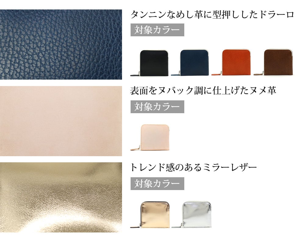本体にはカラーにより表情の異なるレザーを使用。機能性や使い心地だけでなくデザイン性にもこだわったアイテムとなっています。また、本体にドラーロを使用したカラーの内装には、イタリア産のブッテロレザーを使用しています。