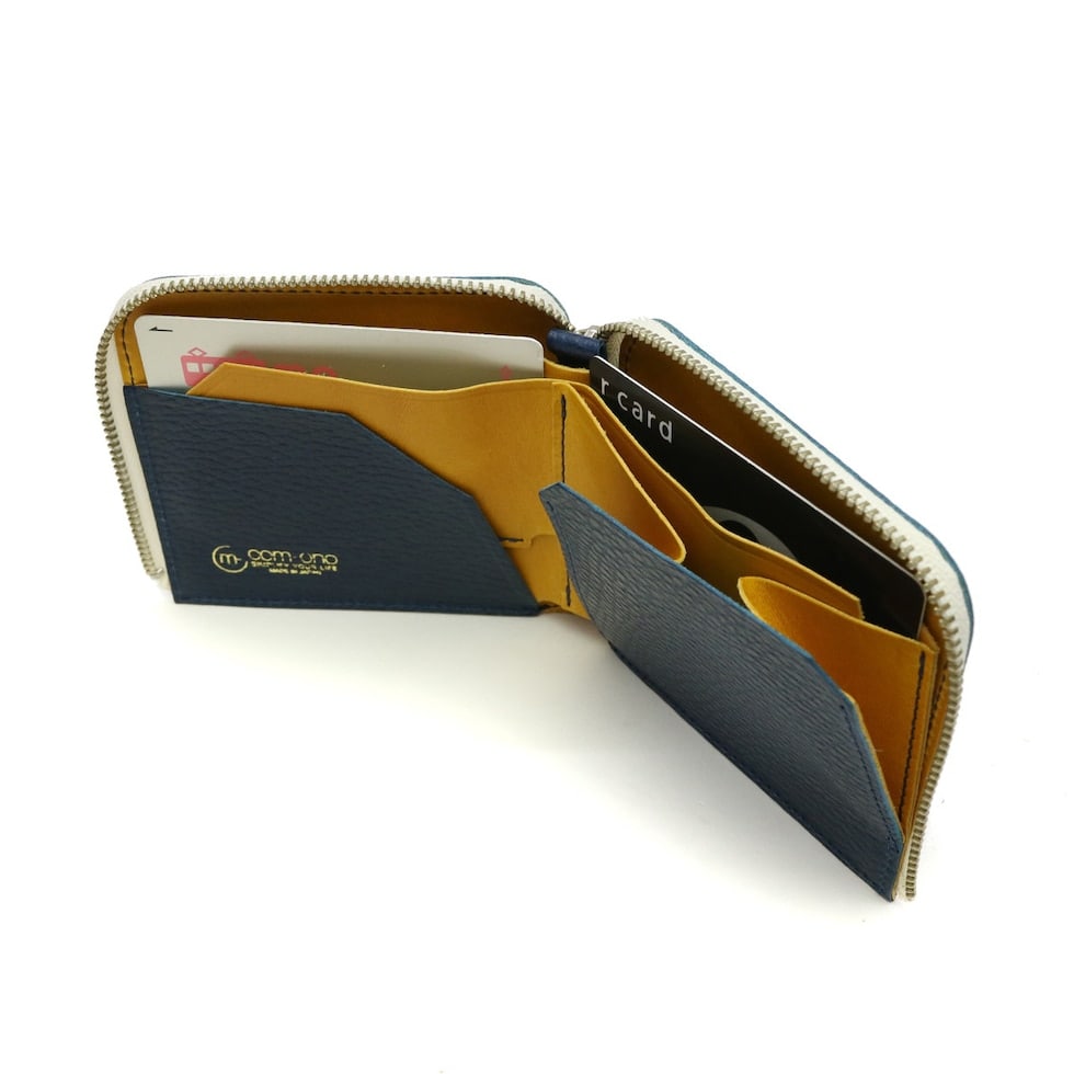 ファスナーを開くと全面が見渡せ、視認性に優れた内装。スリムながら必要な収納はしっかりと搭載しています。カード段を上部に設置することで、コインとの干渉を極力避けるように設計されています。