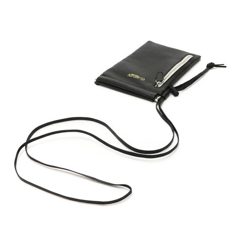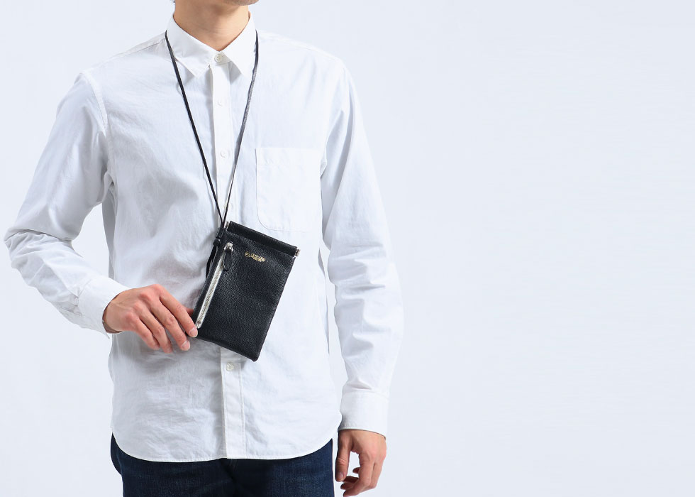 貴重品類をコンパクトにまとめて首から下げられる『Slim-003 / slim neck wallet』。肌なじみがよく、傷に強いクロムシュリンクレザーを使用しています。ストラップのエンドパーツで長さも調整でき、使い方は自由自在。