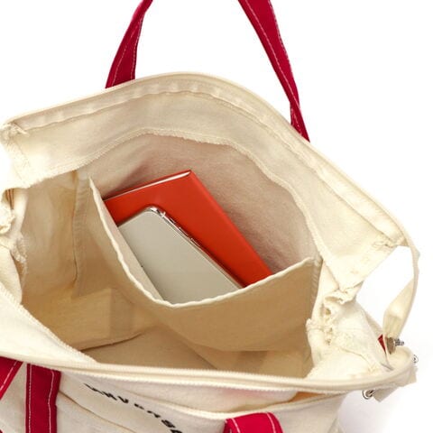 アーチロゴがポイントになった2WAYトートバッグ。ショルダーストラップが施され、斜め掛けや肩掛けなど荷物の量やスタイリングに合わせて持ち方をアレンジできます。A4サイズがすっぽり収まる大きさで荷物の出し入れがしやすく、間口の部分にファスナーが付いているため、荷物が飛び出す心配がありません。キャンバスのナチュラル風合いが楽しめるシンプルなデザインのため、オールシーズン使えるおしゃれアイテムです。