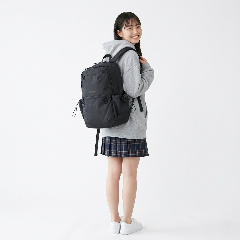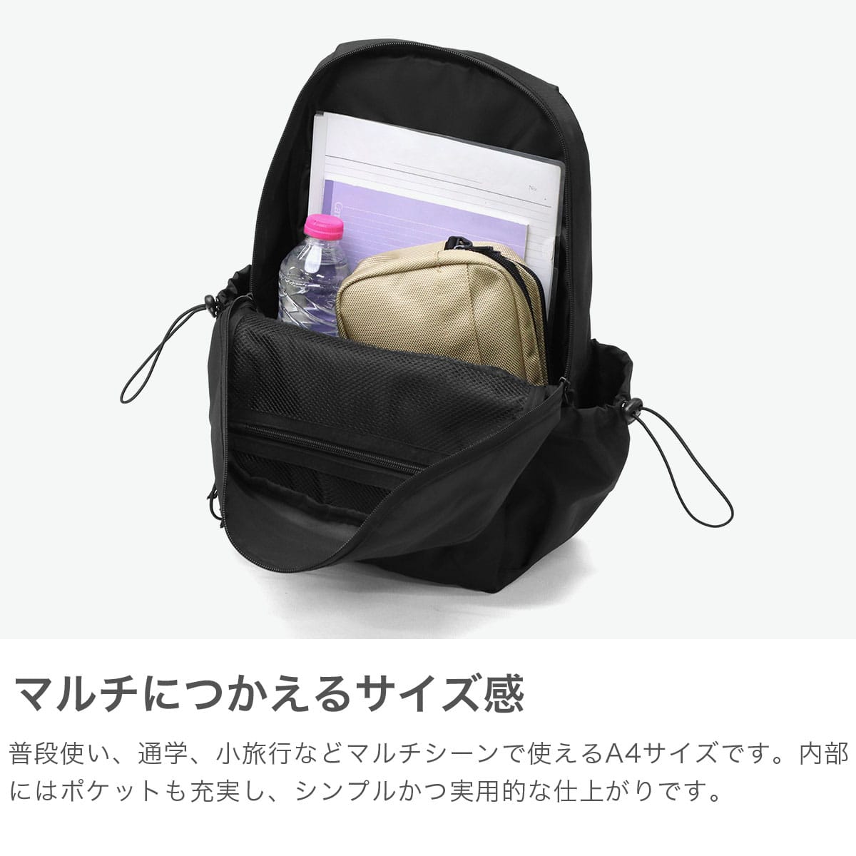 シーンや性別を問わず、マルチユースに活躍するリュック。シンプルで洗練されたデザインに、ブランドらしさを感じさせる星型のファスナー引手がさりげないアクセントになっています。メイン収納はA4サイズに対応し、書類やノートなどをすっきり収納できます。さらに両サイドには便利な巾着型ポケットを備え、日常使いに嬉しい機能性をプラスしました。軽量で扱いやすいポリエステル素材を採用し、長時間の持ち歩きも快適。学校や通勤はもちろん、レジャーや旅行など幅広く使えるコンパクトなバックパックです。