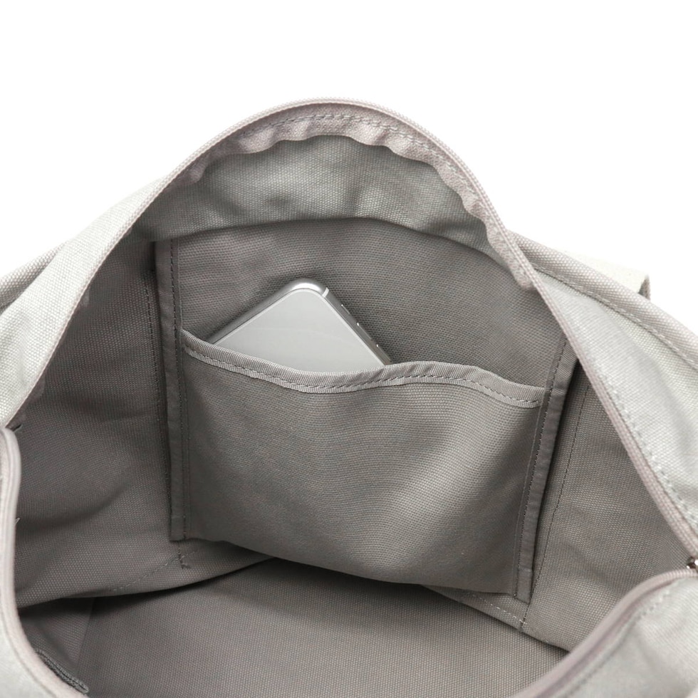 開口部にファスナーが付いた収納スペースは、A4サイズ対応でデイリーユースにちょうど良いサイズ感。広々としたマチを設けているので普段持ち歩く荷物をたっぷり収納できます。また、内外に設けたポケットで小物もスッキリ収納可能です。