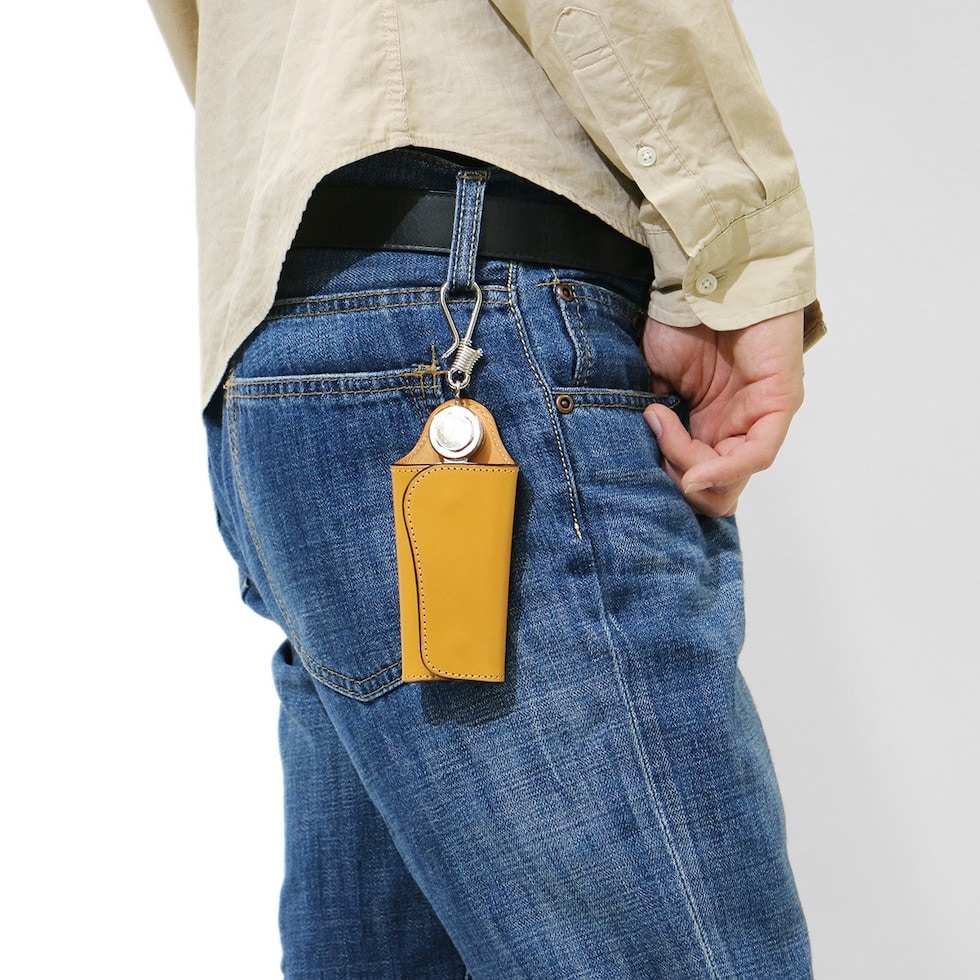 デザインのポイントにもなる、360度可動式のパーツには2重リングが装備され、お手持ちのキーの形状に合わせてお使いいただけるよう工夫されたデザインになっています。釣り針型の金具はパンツのベルトループやバッグなどに掛けてお使いいただくことが可能です。
