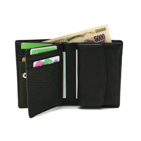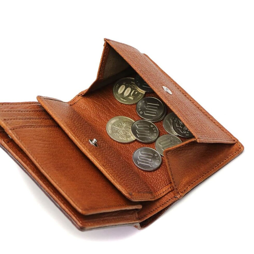 内装は中ベロを設けた構造になっており、スナップボタン式のため邪魔になることなく使用することができます。また2層式の札入れや、計14カ所の豊富なポケットが備わっており、シンプル設計ながらしっかり収納ができるアイテムです。