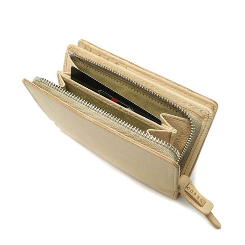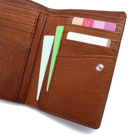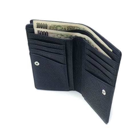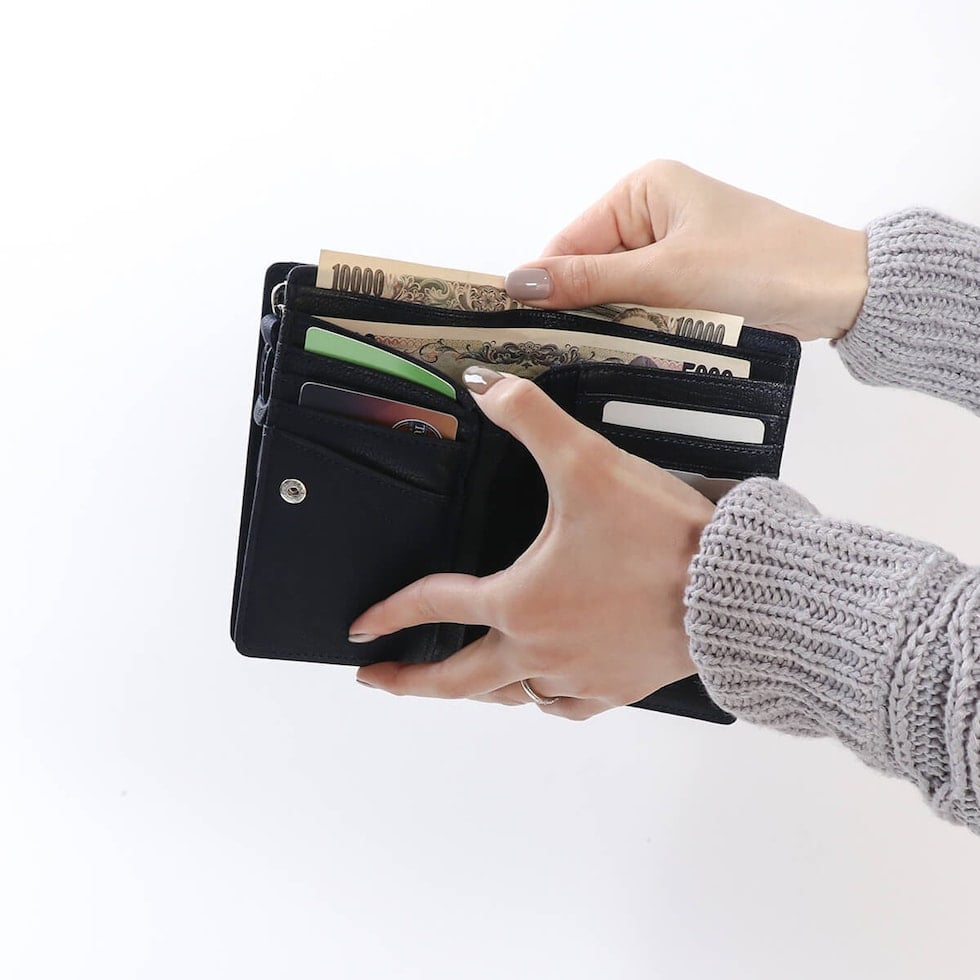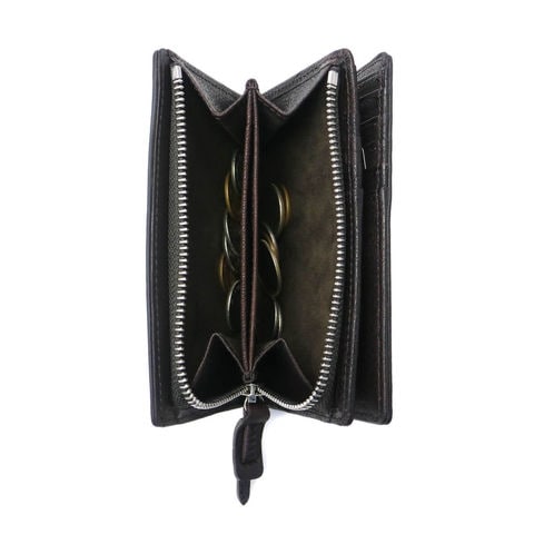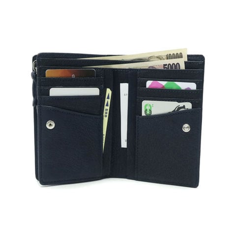 スナップ開閉の本体は見開きで見やすく、必要なアイテムをスムーズに取り出せるのがポイントです。また2層式の札入れは、金額別にお札を仕分けたりレシートの管理としても使用可能。小銭入れの中央にはポケットが設けられ、使う頻度の高いカードなどの収納に役立ちます。