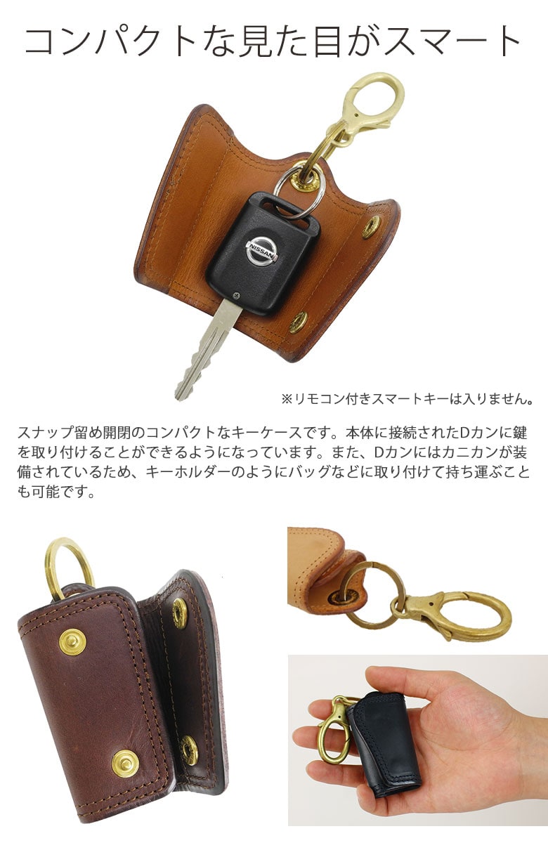 イタリアの独特なオイル鞣しと色合いの皮革を使用したコンパクトなカーキーケースです。味もコシもオイル感も絶妙で、なによりもこの皮革の表情の変化は皮革らしい深みをもっています。使い始めてすぐに実感できるほど艶が出やすく、色も深みを増していきます。また、Dカンにはカニカンが装備されているため、キーホルダーのようにバッグなどに取り付けて持ち運ぶことも可能です。