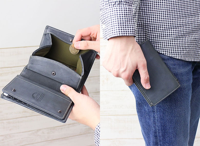 本製品の皮革は銀面(皮革の表面)を軽く擦り、染色と程良いオイル加工で色や腰をソフトに落ち着かせ、さらにワックス加工を施すことで摩擦による焦がしの効果が出やすくなり、豊かな表情と多彩な色の変化をお楽しみ頂けます。しかし、銀擦り皮革のデメリットとして、使いはじめに『色落ち』があります。衣類などへの色落ち色移りに十分ご注意下さい。使い込むうちに艶や色の深みを増し『色落ち』も落ち着きます。その時の銀擦り皮革の表情をぜひ実感して頂きたく、あえて色止めを最小限にしています。ご理解の上ご購入をお願い致します。