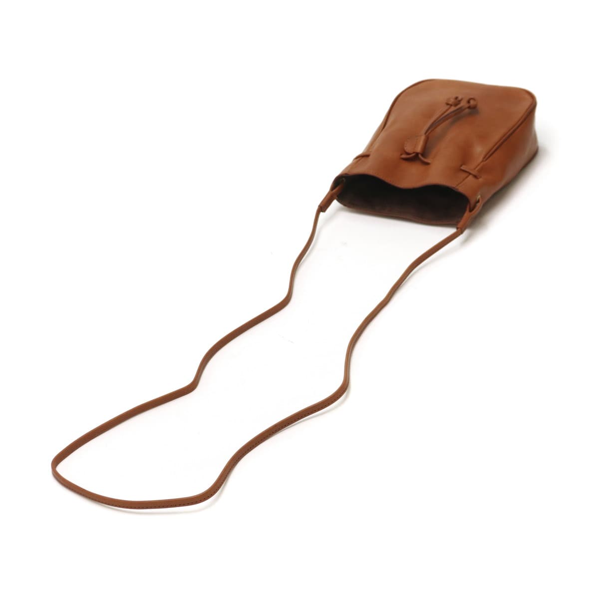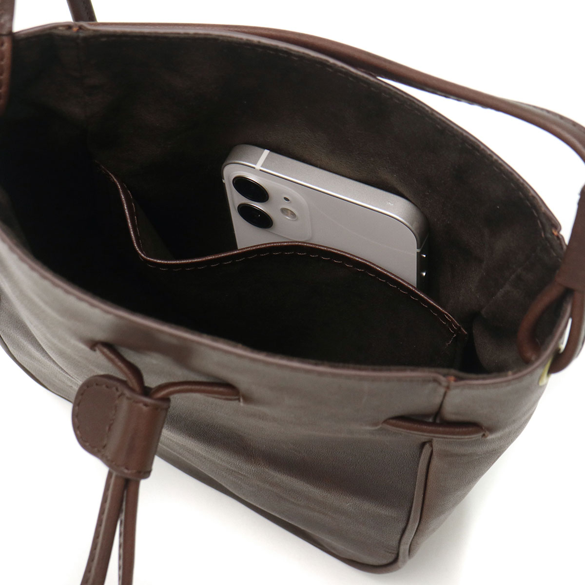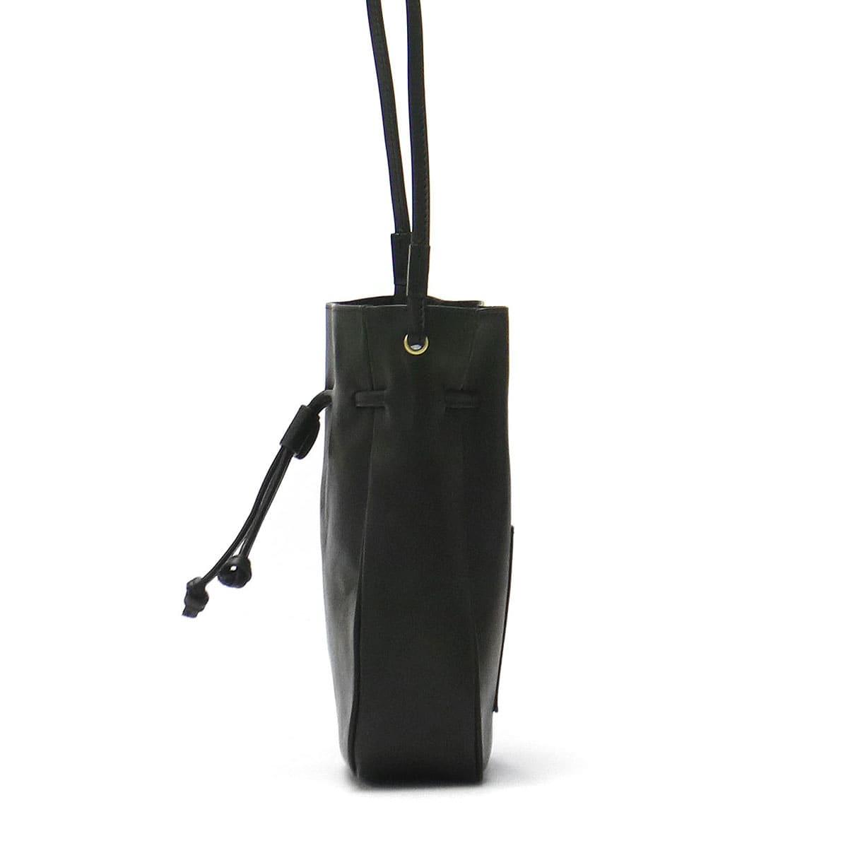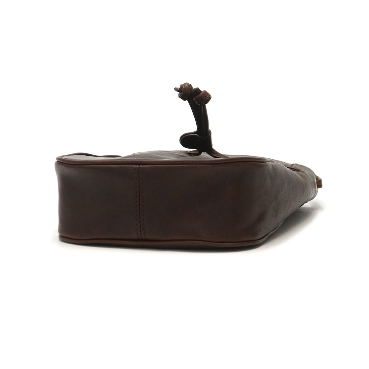 使い勝手の良いサイズ感で人気の根強い、巾着タイプのレザーミニショルダー。ショルダーストラップの長さは十分にあるので、コートやダウンに合わせても斜めがけしやすくなっています。落ち着いたカラーなので、性別や年齢、コーディネートを選ばずマルチに活躍します。