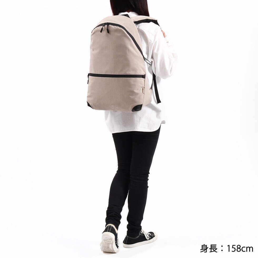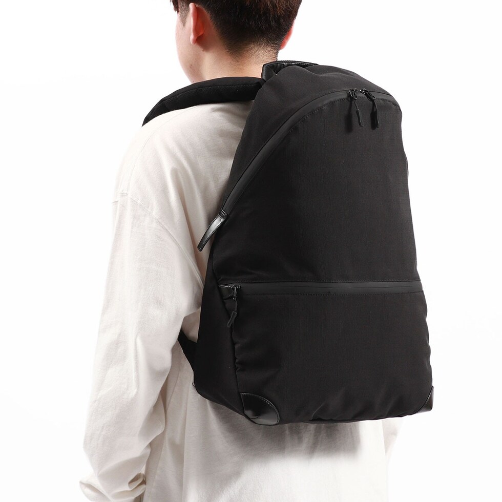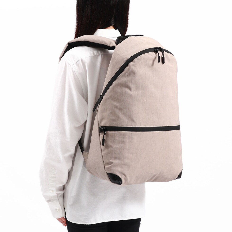 二等辺三角形のようなフォルムが特徴的で、サイドポケットも無くかなりスッキリした印象ですが、高さと幅が比較的大きいのでしっかり荷物が入ります。PC収納のほかに、小物の収納に便利なジップポケットやバッグ前面のポケットなど使い勝手の良いデザイン。また、ポリエステルでありながら麻のような質感の生地は、使用済みのペットボトルから再生されたポリエステル繊維「エコペット」を使用。さらに特注で撥水加工を施すことでハリが生まれ、水にも強いサスティナブルリュックとなっています。