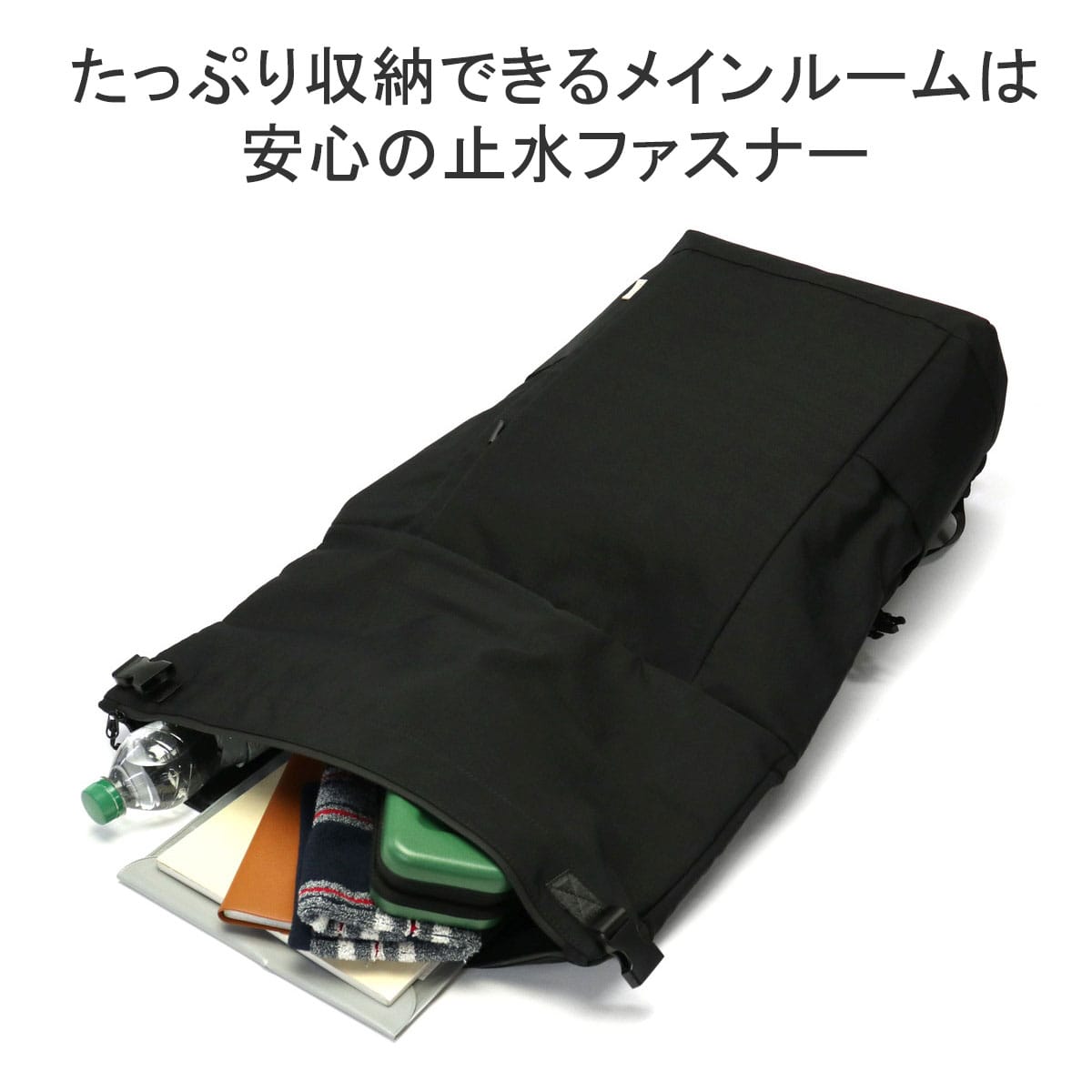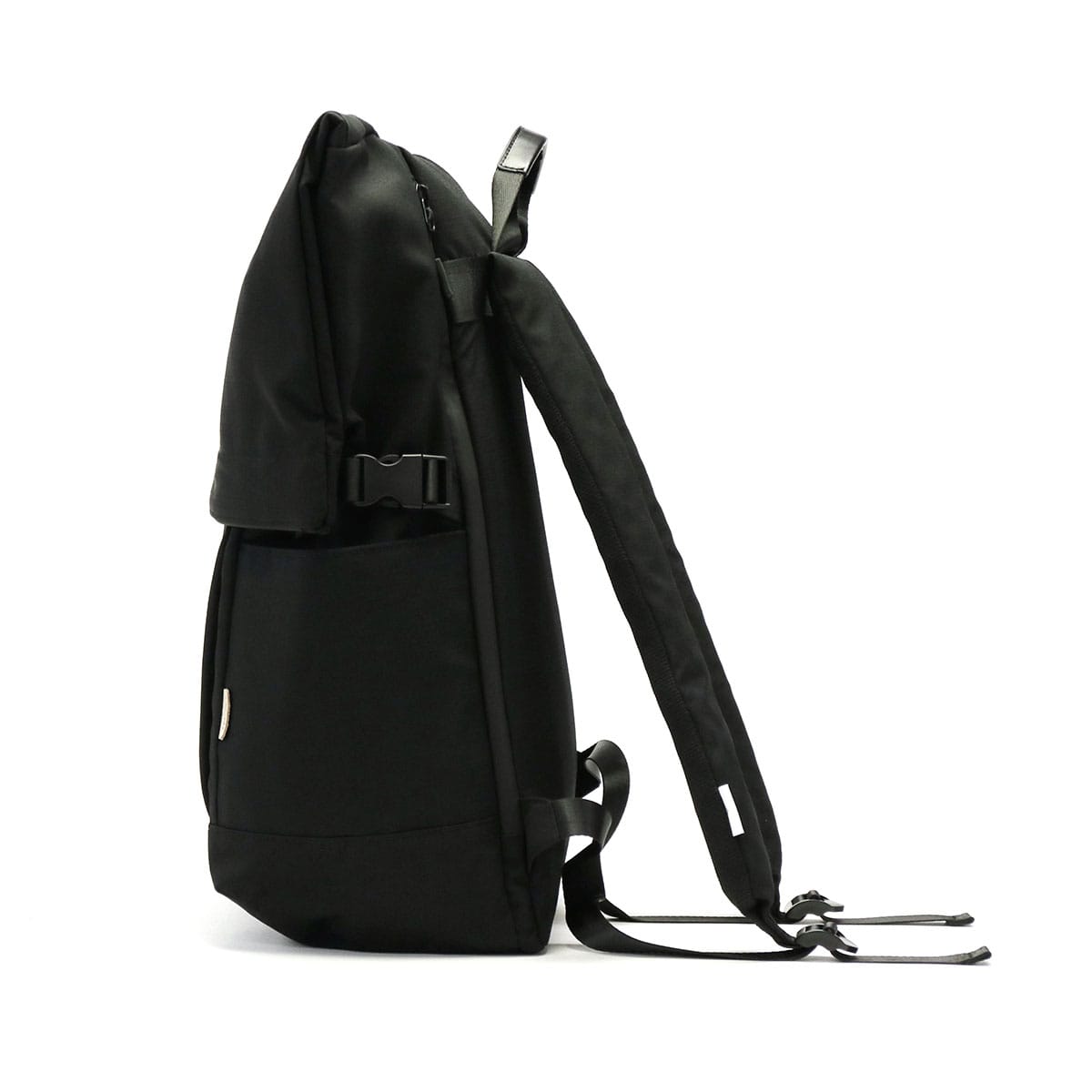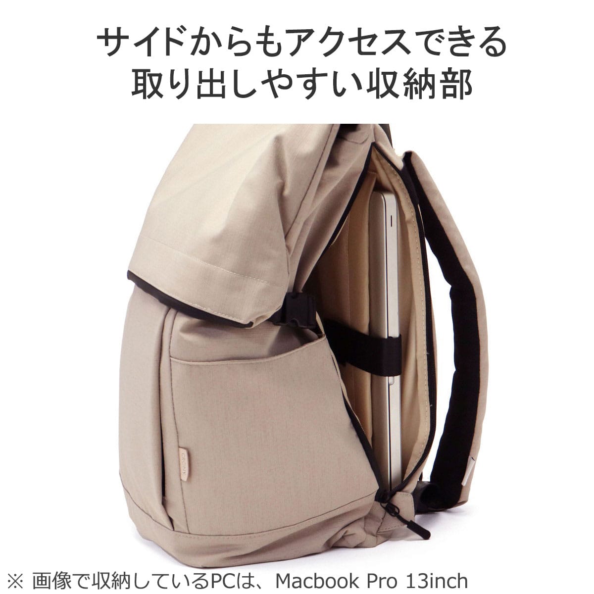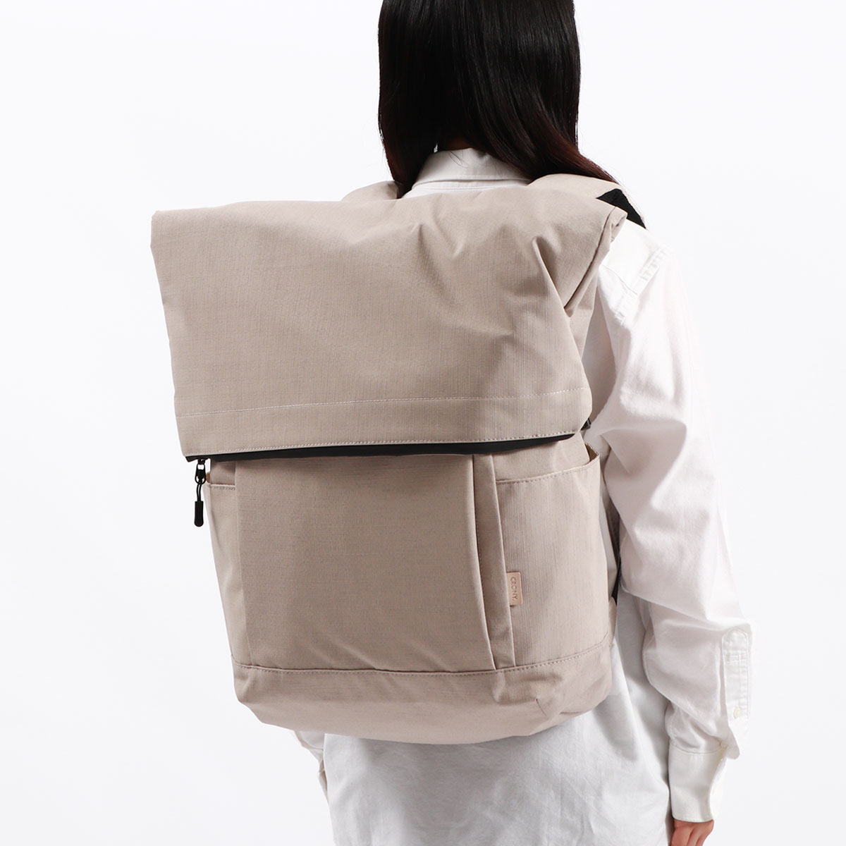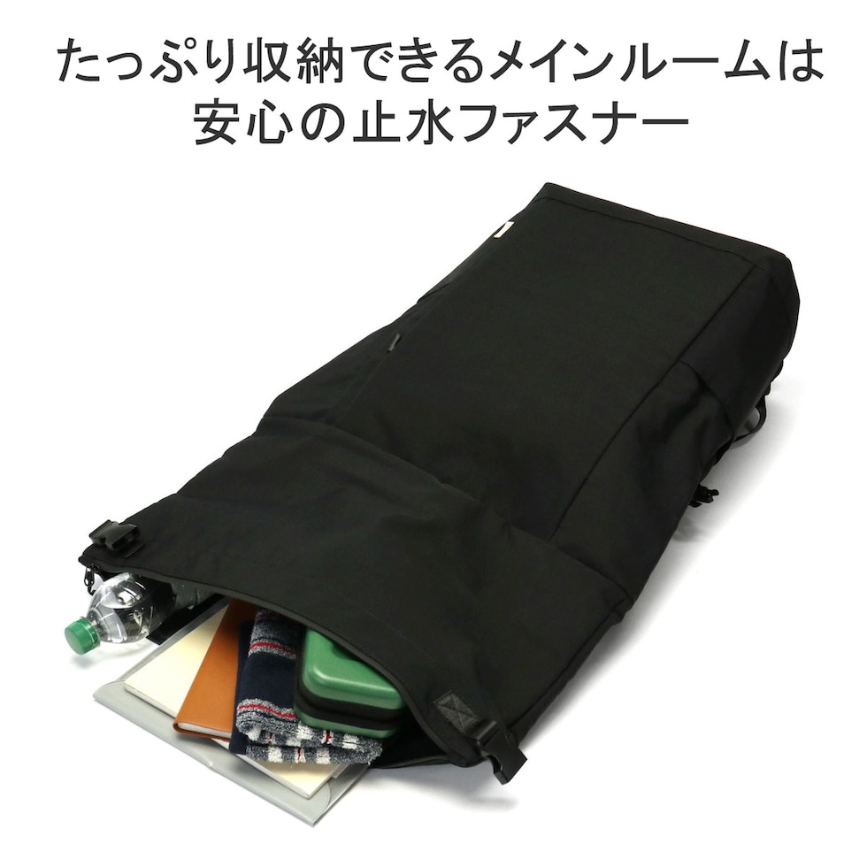 詳細説明 マチを広く取り、ざっくりと荷物を入れるのに便利なB4サイズ対応のメインルームへは、ロールを広げた状態のバッグ上部か、バッグ前面のサイドポケット脇にあるファスナーからアクセスが可能なデザイン。背面左側には、横からノートPCを収納できる仕様となっており、使いやすさにもこだわりました。また、ポリエステルでありながら麻のような見た目と風合いが特徴の生地は、使用済みのペットボトルから再生されたポリエステル繊維「エコペット」を使用し、さらに特注で撥水加工を施すことでハリが生まれ、水にも強いサステイナブルリュックとなっています。