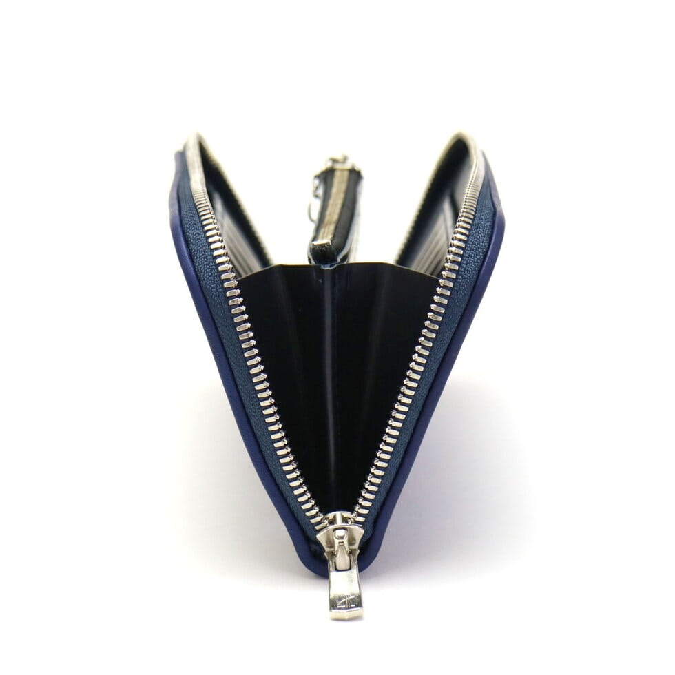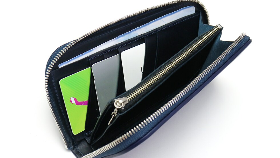 中央に小銭入れを設け、2層の札入れを備えた内装デザイン。紙幣と領収書を分けて収納することもできます。また、片側のマチを無くすことで大きく開き、見やすく取り出しやすいつくりになっています。