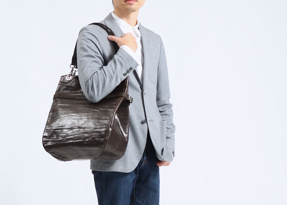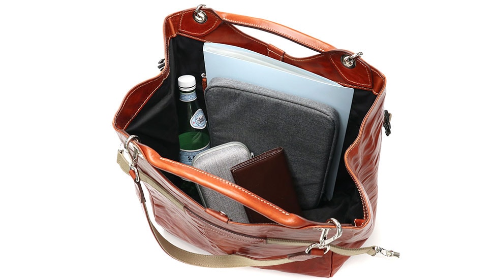 本体はA4書類が悠々と収まるサイズ感。マチを広く設けているので、日々の必要な荷物をすっきりと収納可能。上品な外観でありながら、通勤スタイルからオフスタイルまで申し分なくお使いいただける実用的な設計が魅力です。