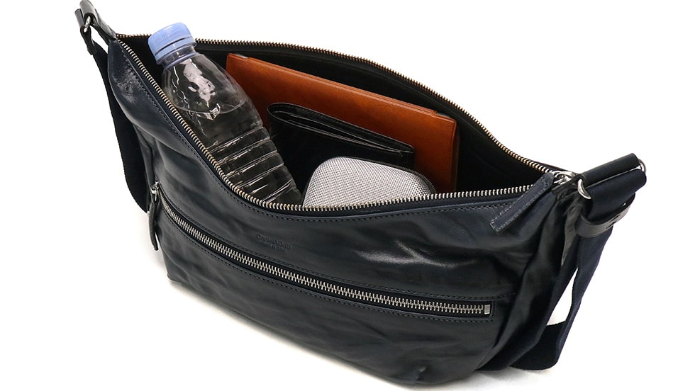 本体の見た目はスマートながらも、マチ幅を広く備えた設計なので、長財布や500mlペットボトルも余裕をもって収まります。また、内外それぞれに荷物の仕分けに役立つポケットを備え、整理整頓もしっかりと行えるデザインです。