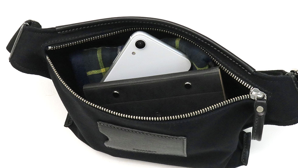 本体は折り財布やスマートフォンを収納するのにジャストなサイズ感で、アクティブにお出かけを楽しめます。スリムなフォルムながらもマチ幅を程よく設けているので、小物類をまとめての収納や、ハンドタオルなどの少し厚みのあるアイテム管理にも対応可能です。