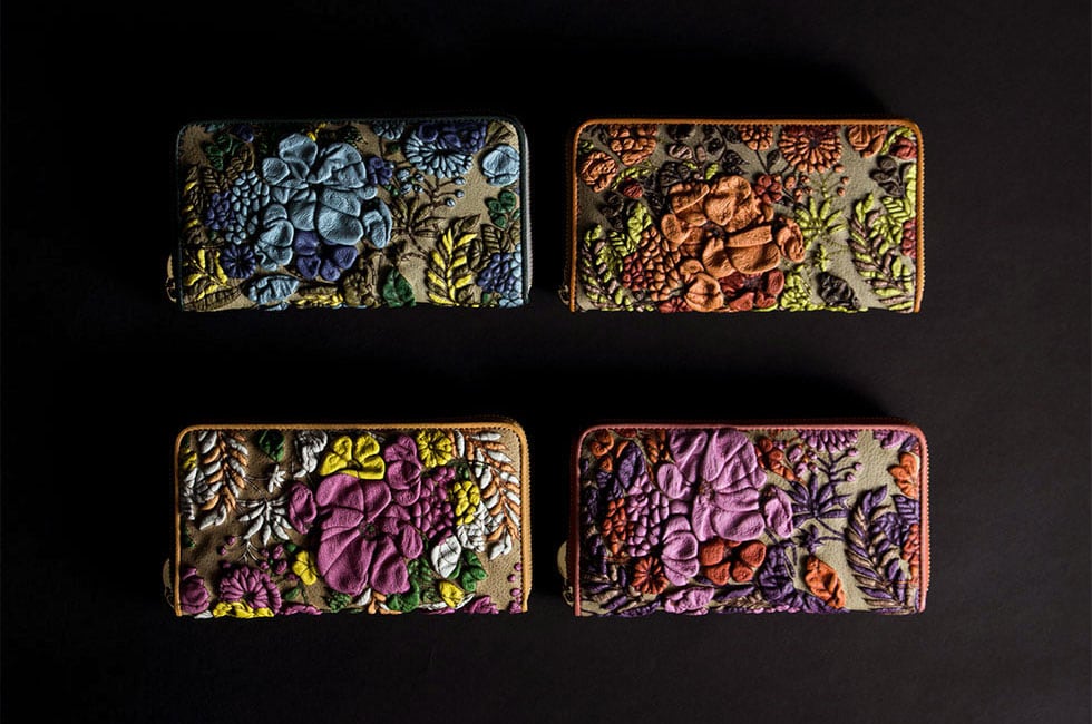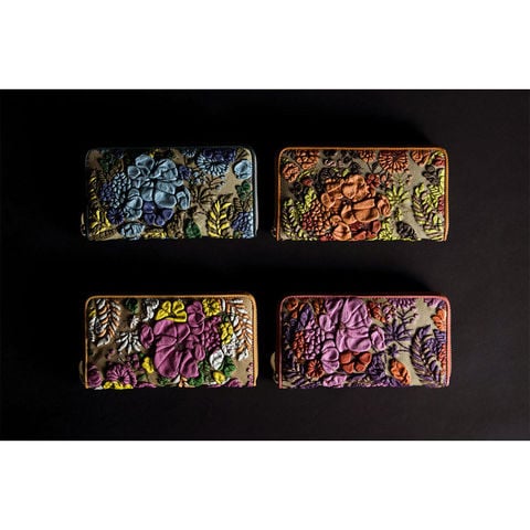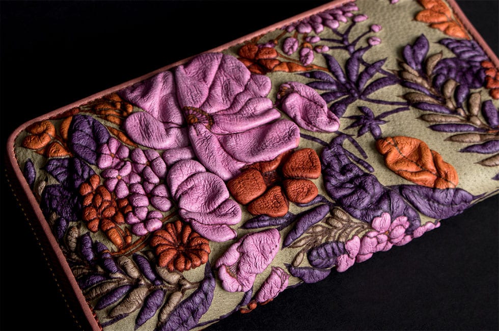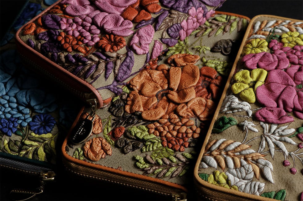 「KYOUKA」シリーズの革は友禅染めの技法を取り入れ、1色づつ染色をしています。さらに、独特な凸凹の花柄を作り出すために特殊加工を施し、1枚の革を1/3ぐらいまで縮ませており、通常の革製品よりも膨大な時間とコストがかけられています。また、1枚の革の場所によって、縮まり方や色の濃淡、柄の位置などに個体差があるため、お客様だけのオンリーワンの商品をお楽しみいただけます。