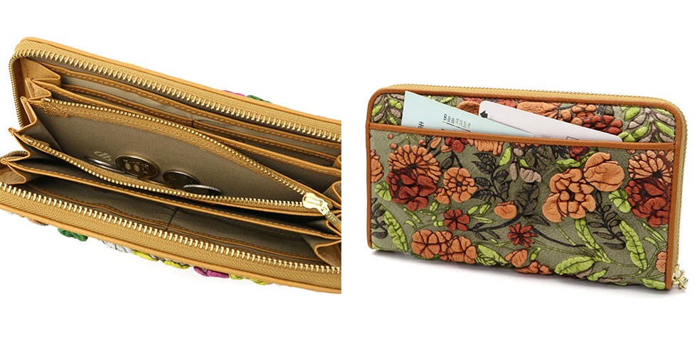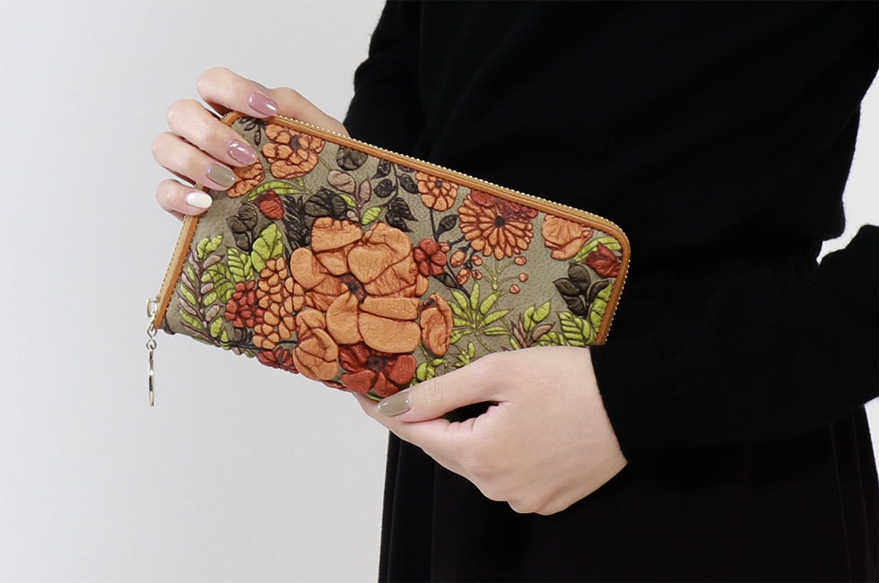 京都伝統の友禅技法と特殊加工で仕上げた立体模様の革を用い、熟練の職人により完成された『decobranche/デコブランシェ』の長財布。特徴的な立体模様はカラフルなカラーバリエーションがあり、持つだけでなく「見る」、「見せる」楽しみを与えてくれます。天然の革の質感ならではの、軽くてソフトな仕上がりも魅力です。