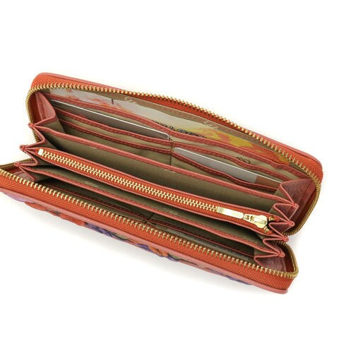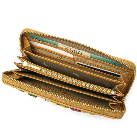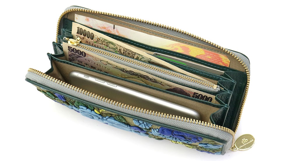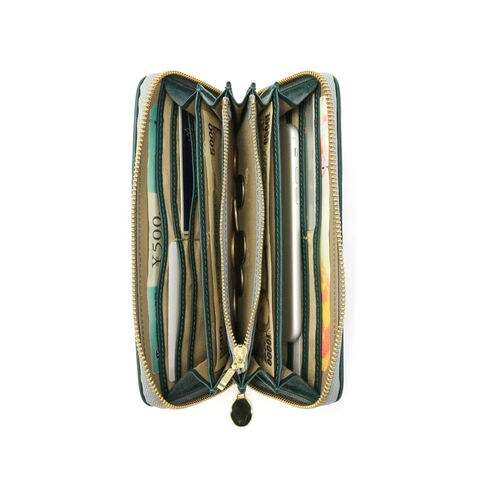 こちらのお財布はラウンドファスナー開閉で、大きく開き使いやすいのがポイント。収納力にも優れており、8枚のカード入れ、他にパスポートや銀行の通帳、スマートフォンなども収納できる大きめサイズになっています。お財布をご使用中の受け取り時などで、モノの出し入れに便利な背面ポケットや、小銭の収納にぴったりのジップポケットなど、使いやすいポケットも充実。
