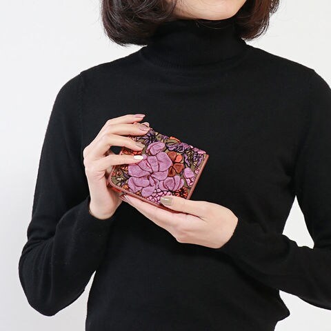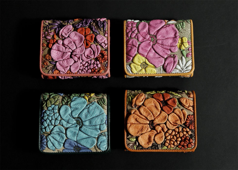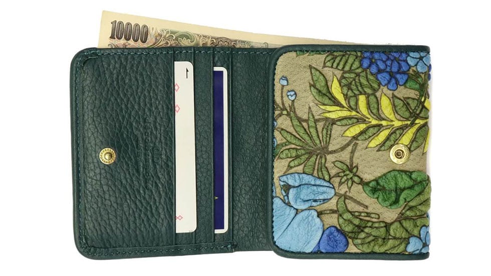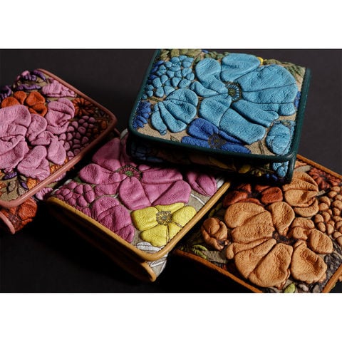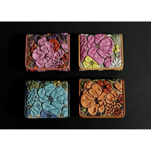 京都伝統の友禅技法と特殊加工で仕上げた立体模様の革を用い、熟練の職人により完成された『decobranche/デコブランシェ』の二つ折り財布。特徴的な立体模様はカラフルなカラーバリエーションがあり、持つだけでなく「見る」、「見せる」楽しみを与えてくれます。天然の革の質感ならではの、軽くてソフトな仕上がりも魅力です。