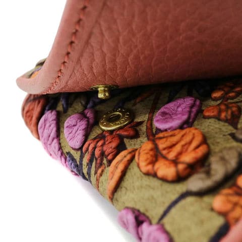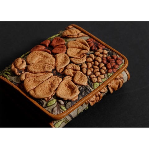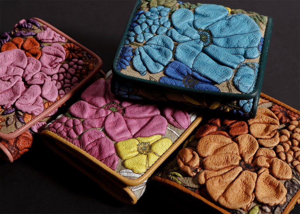 「KYOUKA」シリーズの革は友禅染めの技法を取り入れ、1色づつ染色をしています。さらに、独特な凸凹の花柄を作り出すために特殊加工を施し、1枚の革を1/3ぐらいまで縮ませており、通常の革製品よりも膨大な時間とコストがかけられています。また、1枚の革の場所によって、縮まり方や色の濃淡、柄の位置などに個体差があるため、お客様だけのオンリーワンの商品をお楽しみいただけます。