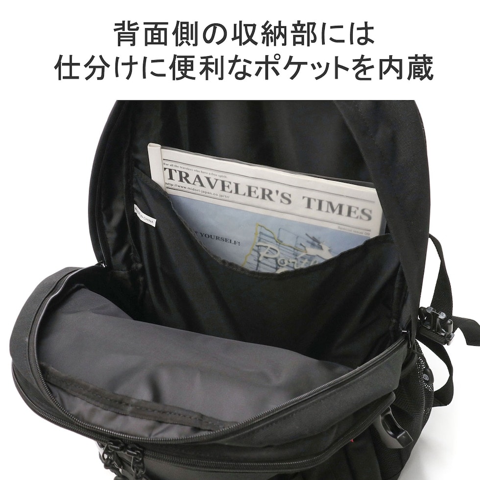 詳細説明 メインスペースは大容量B4サイズ。広々とした背面側の収納部には仕分けポケットを設け、ファイル等、他のアイテムと仕分けて管理したい荷物の収納に役立ちます。前面側の収納部はポケットを設けないシンプルで無駄のないつくり。本体のフロントやサイドには、移動中の取り出しに便利なアウトポケットが充実しているのもポイントです。さらに、本体素材には撥水加工が施されており、デイリー使いに嬉しい仕上がりになっています。