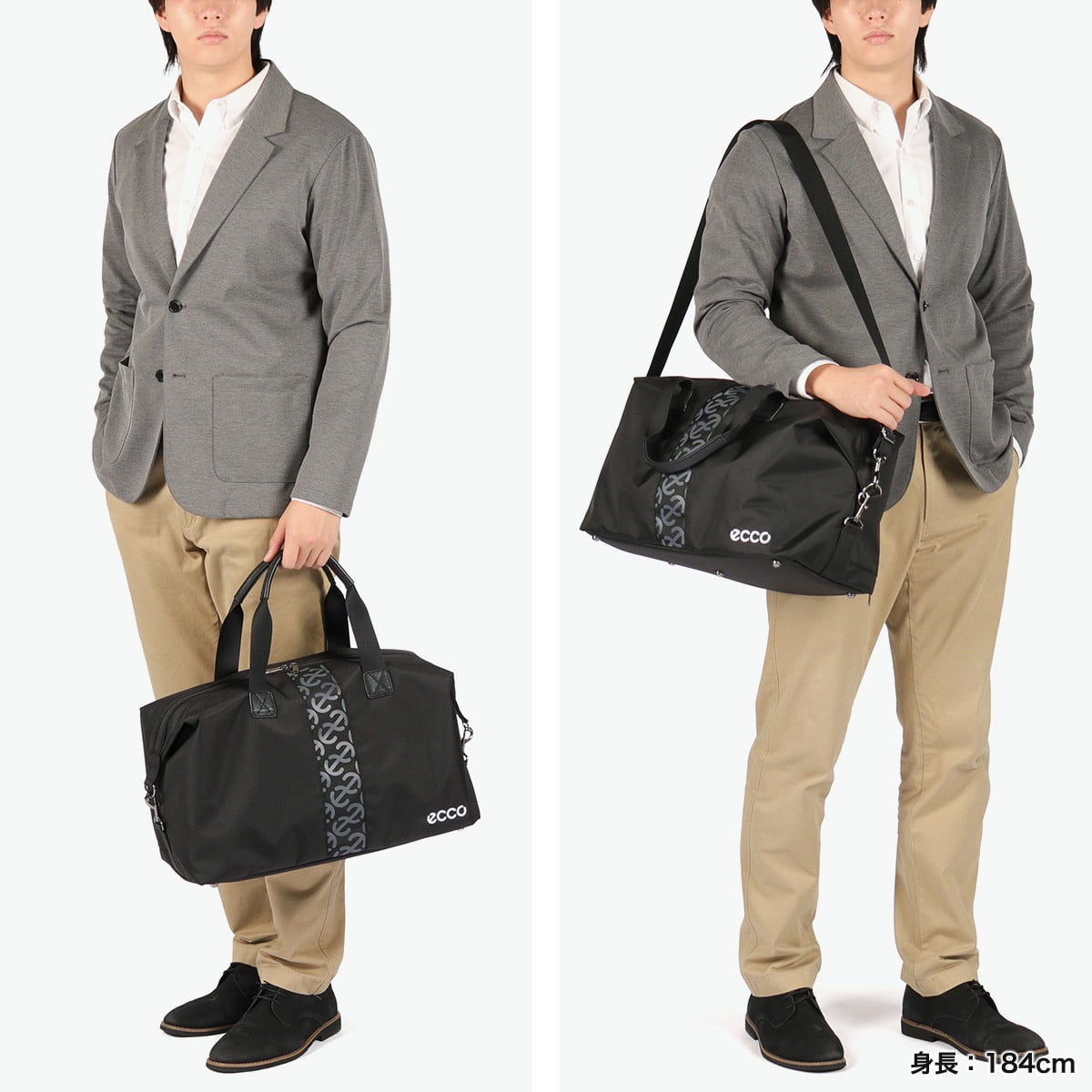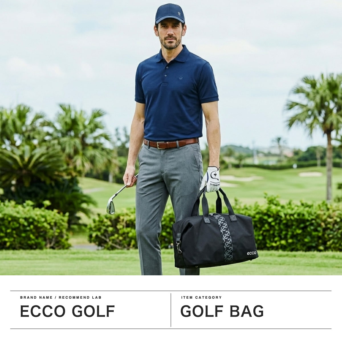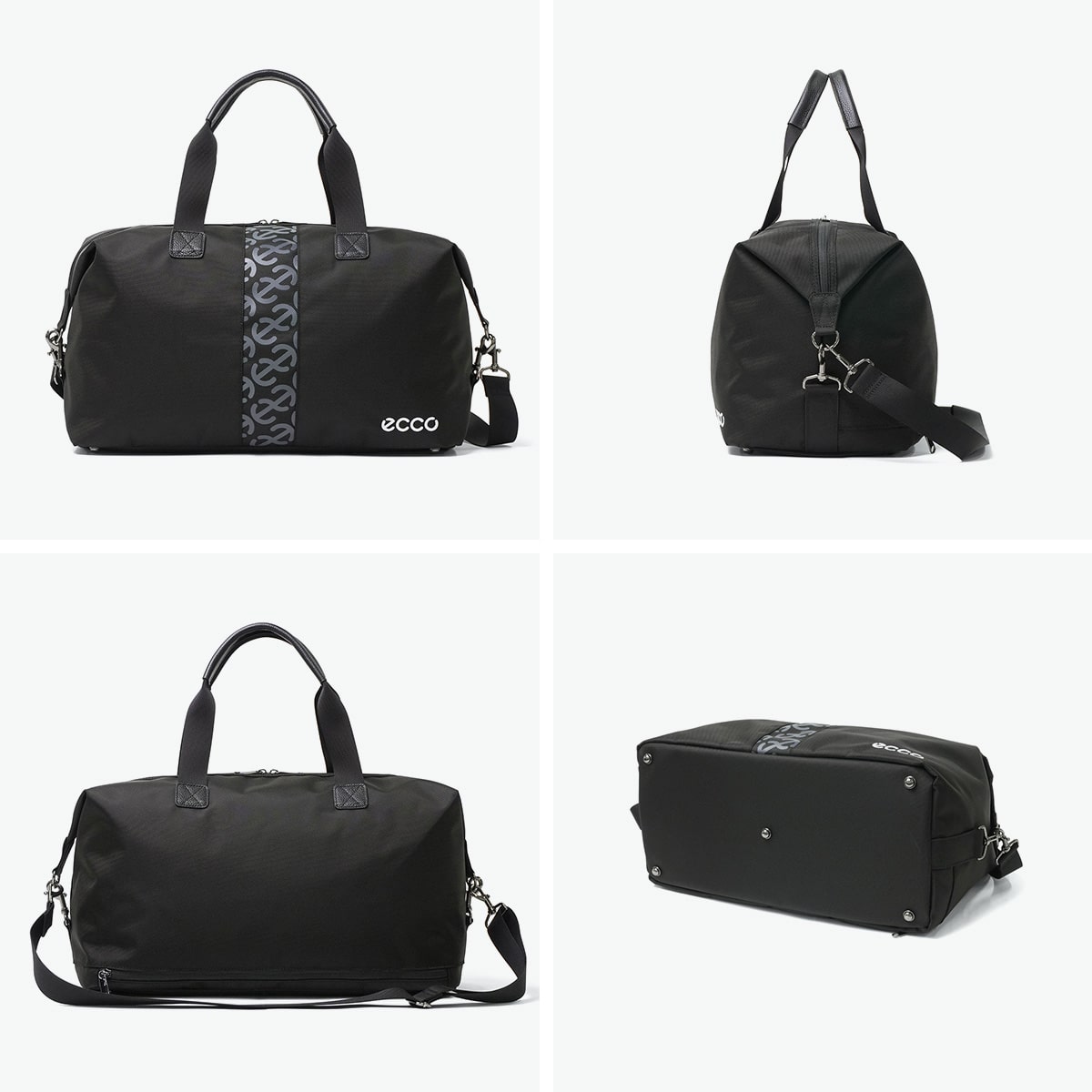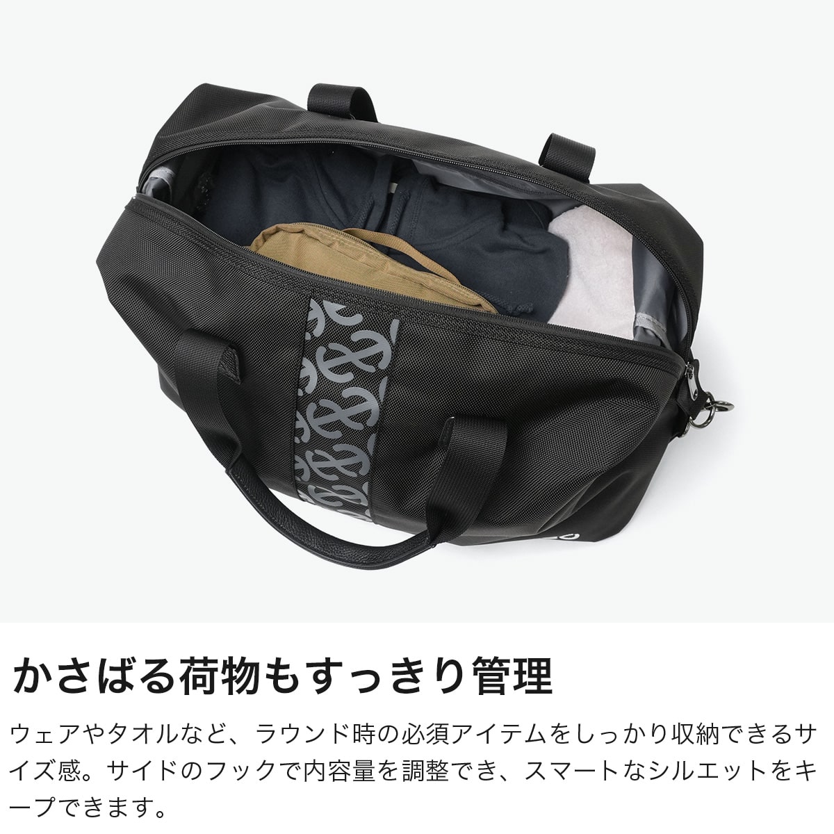 背面下部に便利なシューズ収納を設けたボストンバッグ。サイドのフックを外して収納量を調整可能な作り。ショルダー付きで持ち運びも安心です。オーソドックスな形状ながら、正面に配されたロゴのデザインがアクセントに。ゴルフだけでなく、旅行やタウンユースにもおすすめのバッグに仕上がっています。