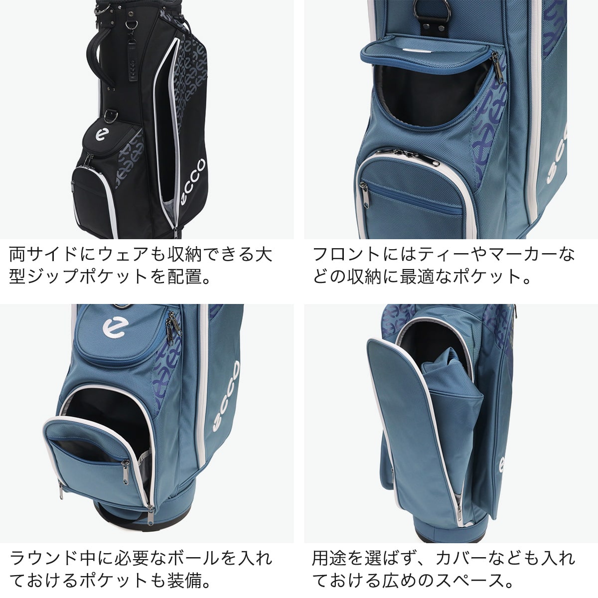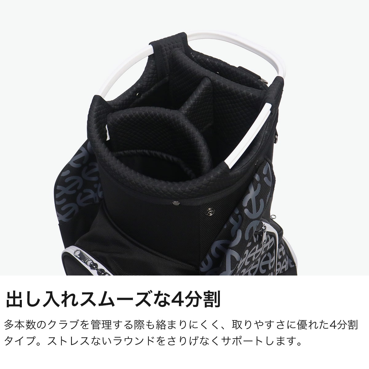 優れた耐久性を持つナイロン素材を採用したキャディバッグ。ボールやティーはもちろん、ラウンドに必要なアイテムを十分に収納できるポケット数を備え、プレー中にアイテムをスムーズに準備できます。入口部分にはクッション性に富んだ生地を使用し、大切なクラブをしっかり保護。クラブの出し入れがスムーズに行いやすい9型を採用し、快適な使い心地を実現しています。