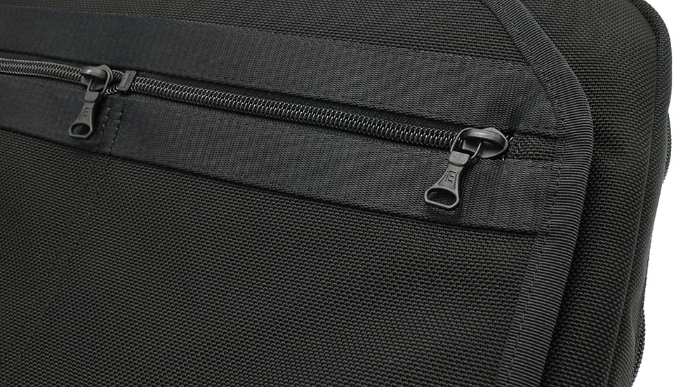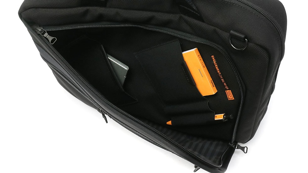 本体に使用しているブランドオリジナル素材「ENGAGED NYLON」は耐久性が高いだけでなく、ブリーフケースで約1100gという軽量性も実現。また、半永久的に持続する優れた撥水性と防汚性を併せ持ち、急な雨天時にも対応します。タフな機能性を高次元で両立した、ビジネスシーンに理想的な素材と言えます。
