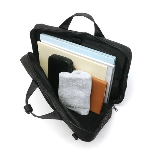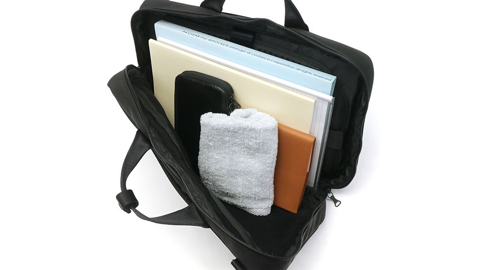 メインルームのファスナーはグルッと大きく開口するため、バックパック使用時の上部からの出し入れにもスマートに対応します。B4サイズ対応でマチも備わるので、書類や手帳など、通勤に必要な荷物をまとめて収納可能。デリケートなデバイスも、クッション性を備えたPC収納部でしっかりと保護します。