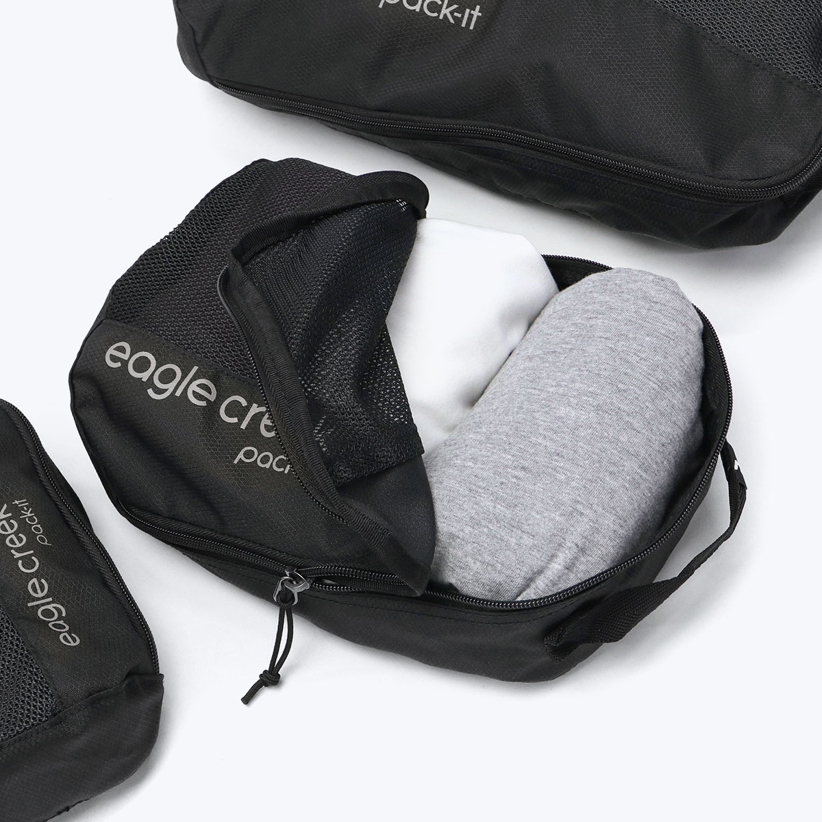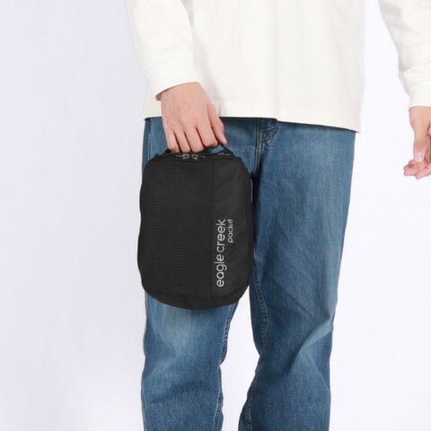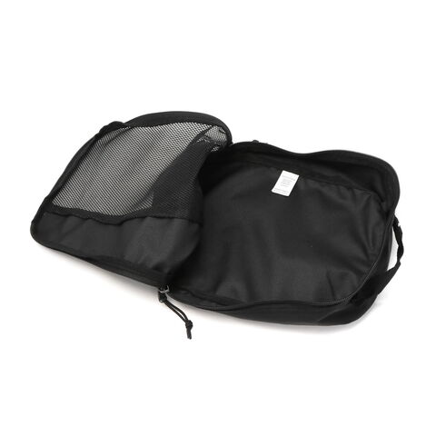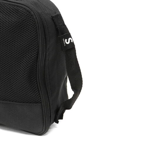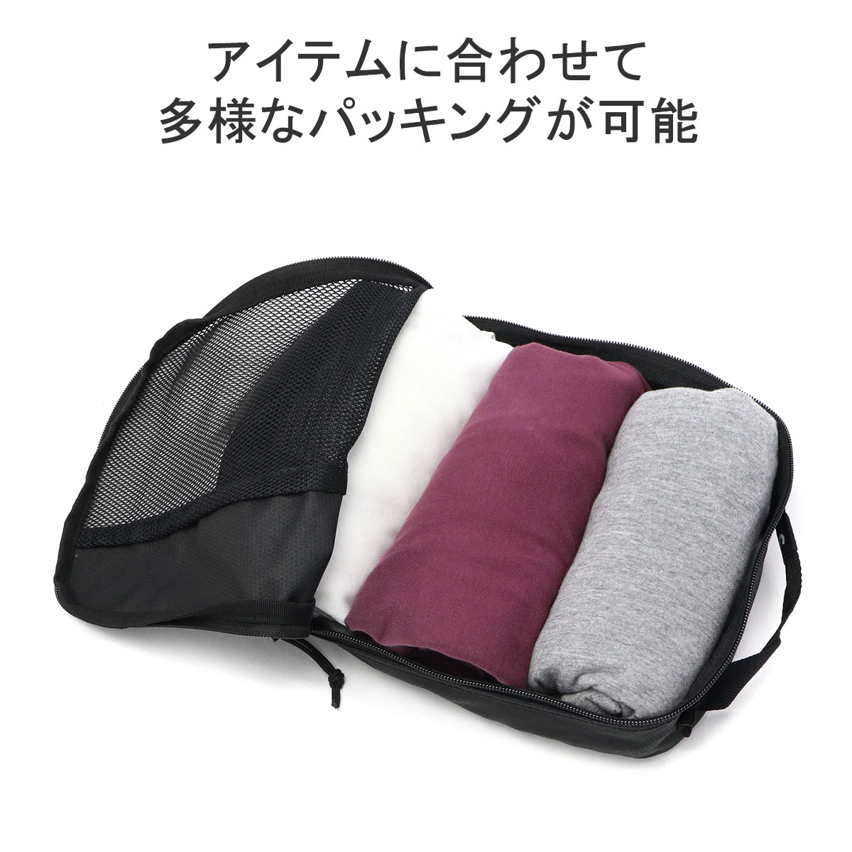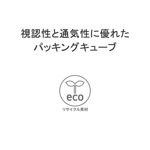 旅行はもちろん、普段使いにも便利なトラベルキューブのSサイズ。アンダーウェアやTシャツなどの収納に最適で、Tシャツは丸めて入れれば5枚程度まで収納可能です。メッシュ部分から中身が確認でき、斜めになったジッパーのデザインにより荷物が詰めやすく、パッキングがスムーズにできます。