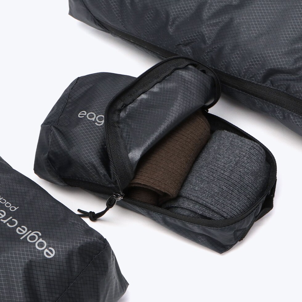 旅行はもちろん、普段使いにも便利なトラベルキューブのXSサイズ。充電器やケーブル類、アンダーウェアからアメニティグッズまで、さまざまな小物を効率的に収納できるサイズ感です。水に強く軽量な、環境にも配慮された100%海洋リサイクル素材を使用。斜めになったジッパーのデザインにより衣類を折りたたんだり丸めて入れても収納しやすく、パッキングスペースを最大限に活用できます。