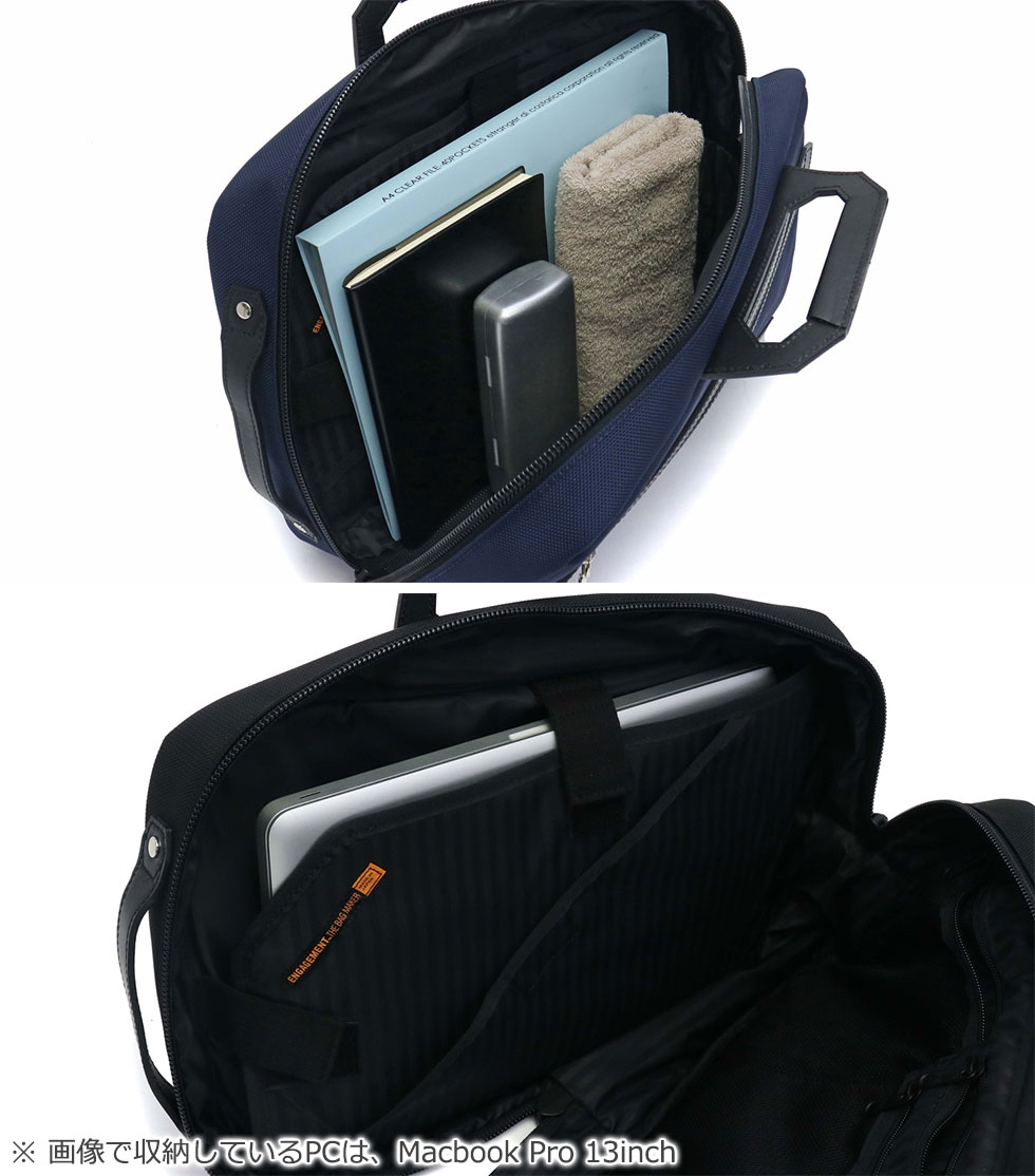 仕様 |[外側] ・ジップポケット(M)×1[ポケット(XS)×2、ペンホルダー×2 内蔵] [内側] ・PC収納×1 ・ベルクロポケット(M)×1 ・ジップポケット(M)×1 ・メッシュジップポケット(M)×1 ・メッシュジップポケット(S)×1 [付属品] ・オリジナル収納袋×1