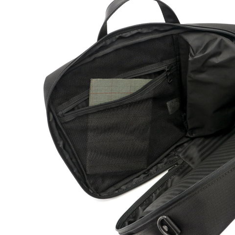 大きく開くメイン収納部はA4サイズ対応の大きさとなっており、広めに設けられたマチ幅で書類やファイルをしっかりと収納可能。内装のPC収納は、リュックとして使用する際にも使いやすい縦横どちらにも対応するデザインとなっています。
