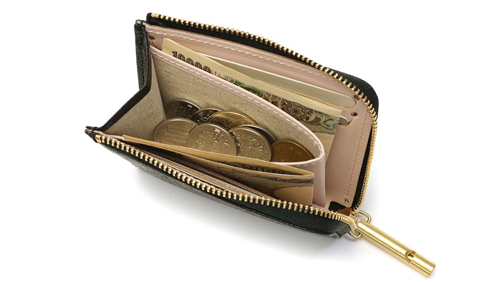 内側中央の小銭入れは、ファスナーレスのため硬貨をサッと取り出せます。また、その両サイドには折りたたんだ紙幣や領収書などをお好みのスタイルでしまうことができます。L字ファスナー式で内部が大きく開くため、取り出しの際ひっかかりがないのも使いやすさのポイントです。