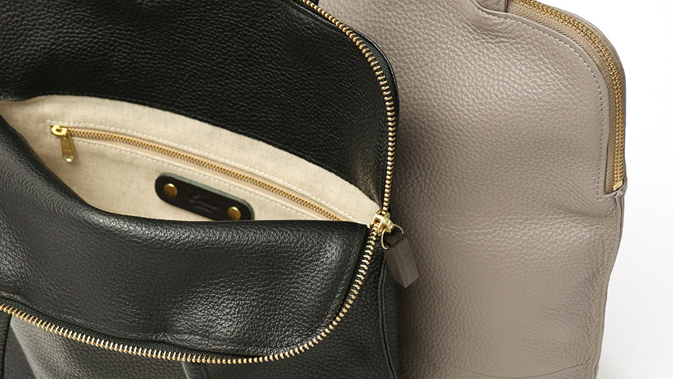 ※使用しているアルミファスナーは素材の性質上、ファスナーの開閉によってアルミの粉が生地を汚す場合がございます。また、はじめはファスナーに引っ掛かりを感じる場合がございますが、使用回数によって軽減されます。ファスナーの特性として、ご了承ください。
