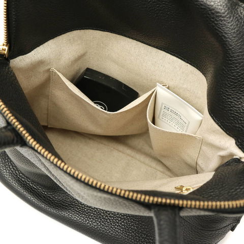 収納口はファスナー仕様なので、貴重品を入れても飛び出さない安心感があります。口が大きく開いて中身が見やすいのも嬉しいポイントです。コンパクトなB5対応サイズで、上品にお出かけを楽しめそうです。内装に備えた小分けポケットは、リップや鏡の収納に最適。