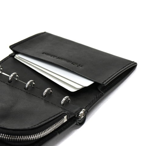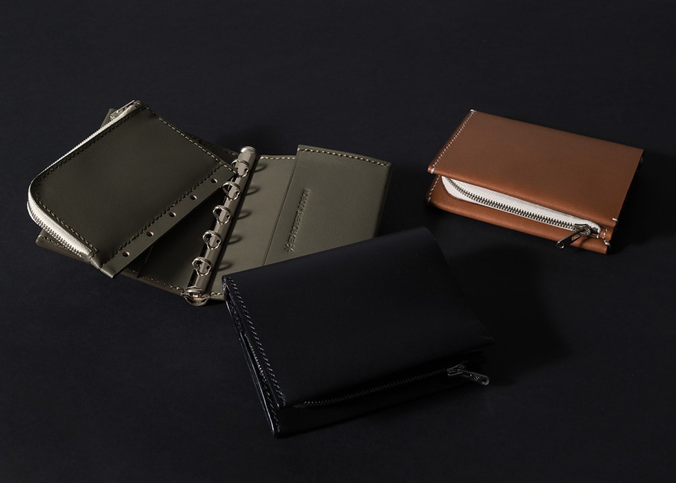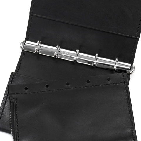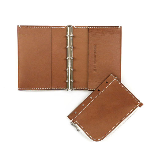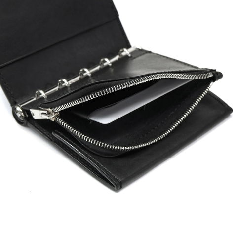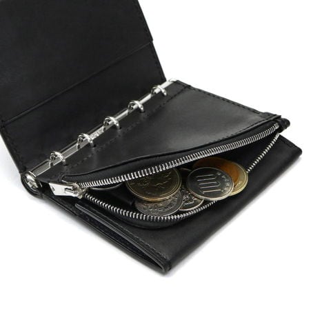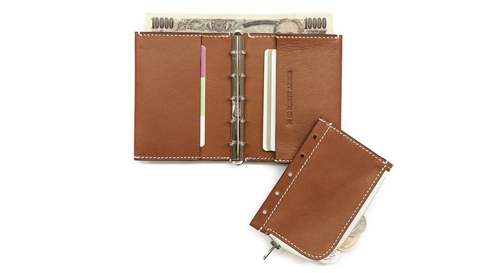 本体はバインダー式で中身の取り外しが可能。取り外した中身をコインケースとして、残りはカードケースとして使うなど、収納スタイルを自在に変える事ができます。背面にはさりげなく札入れスペースがあり、お札を折らずに保管できるのもポイント。
