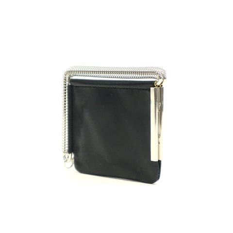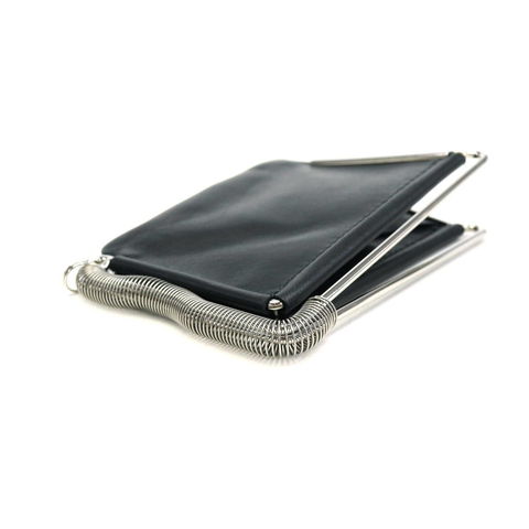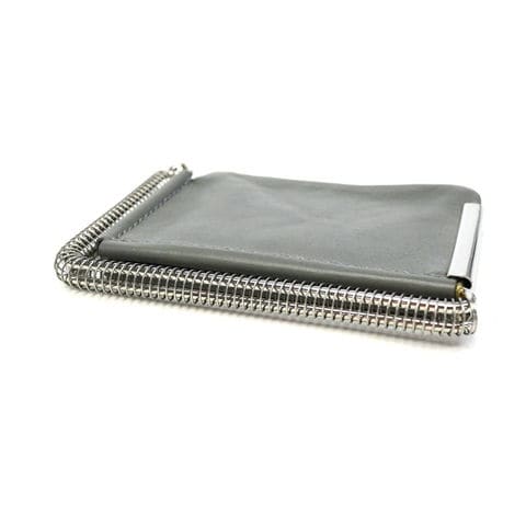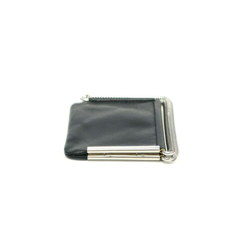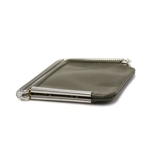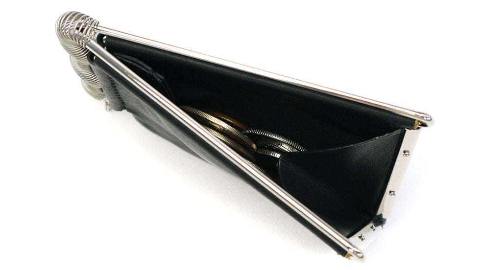 本体はL字フレームの短辺にバネを寄せると開口し、フレームを閉じるとバネの戻る力で収納口をロックするユニークなデザイン。すっきりとスリムなつくりで、必要最小限のコインをまとめることができます。
