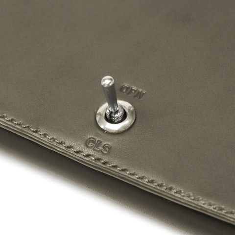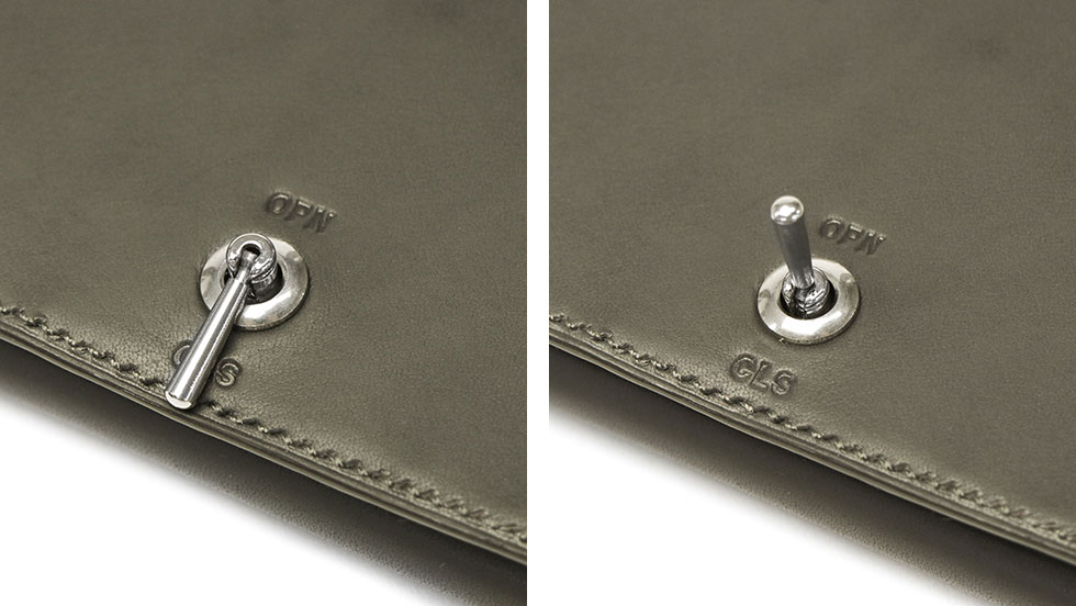 本製品は開閉する度、微かに「カチッ」という音が鳴る、遊び心ある一品です。開閉具の上下にはOPN(OPEN)とCLS(CLOSE)の刻印を入れており、まるで本当の電気装置のように、スイッチのON/OFFを彷彿とさせます。