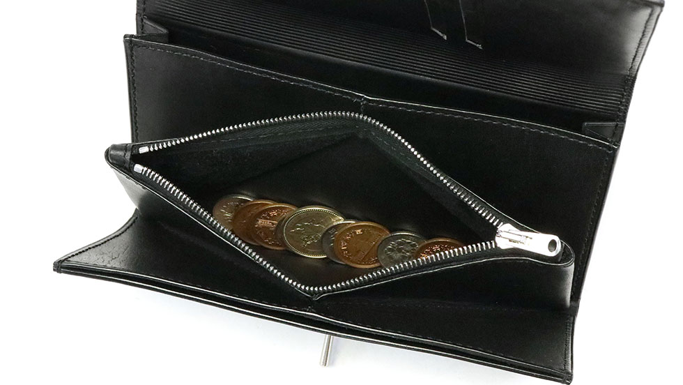 シンプルでクリーンなルックスを追求しながらも、機能性は非常に高いクオリティを求めるのがブランドのコンセプト。本製品の一番のポイントは、立体構造のコインポケット。ひし形に大きく口が開くので、細かい小銭の収納も取り出しもスムーズに行えます。