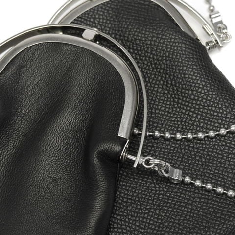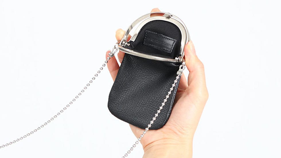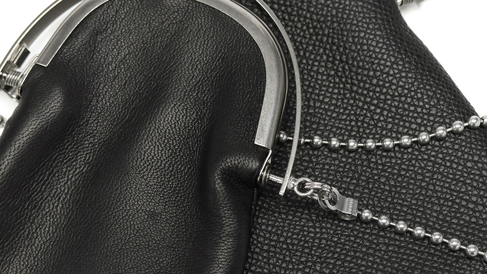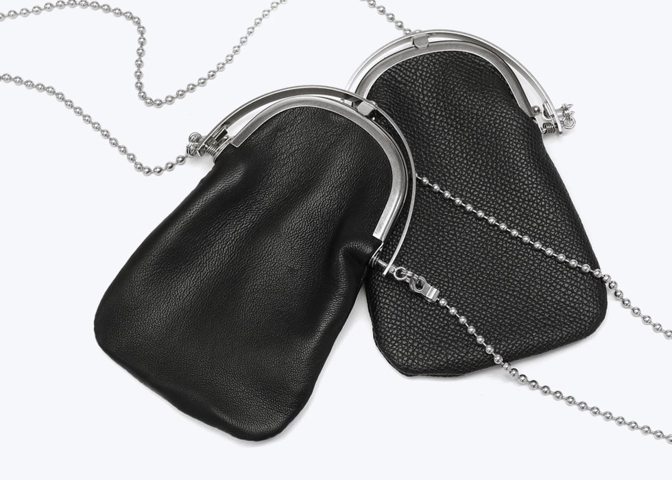 "日常の物事をヒントに"。思わず触りたくなるような『仕掛け』を用いたアイテムを製作するED ROBERT JUDSON。こちらはドイツのワインハイマー社のカウレザーを使用した、ワンタッチ仕様のがま口チェーンパース。手のひらサイズの小ささに設定し、チェーンはどこか見覚えのあるデザインを採用しました。
