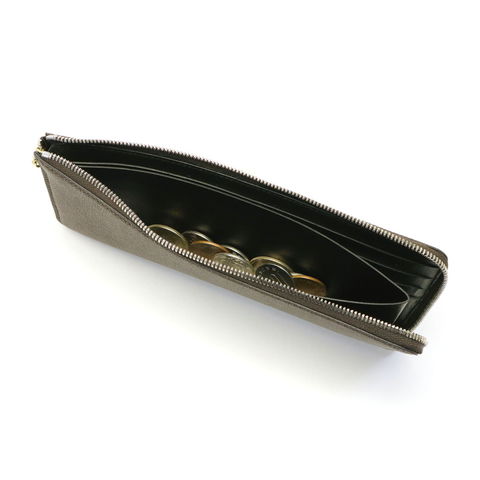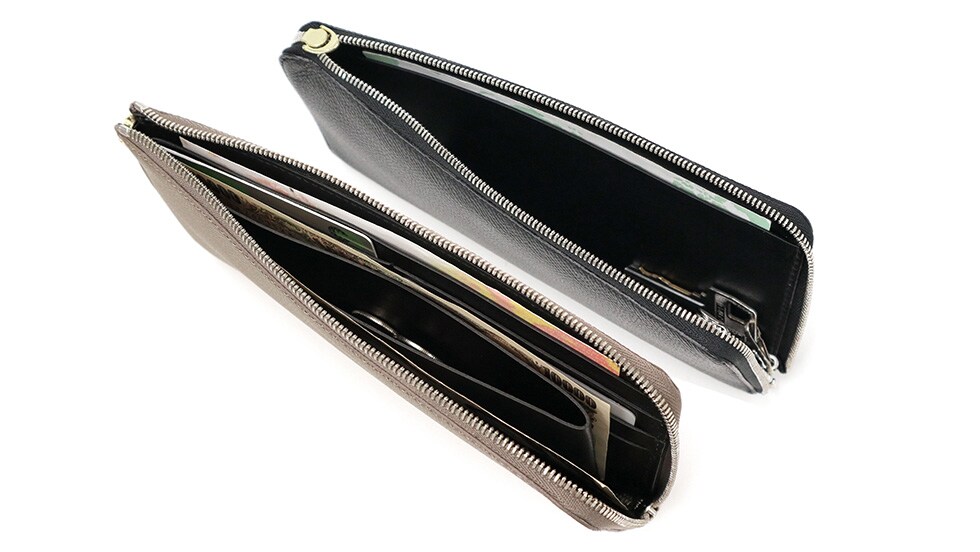 本体は薄型でありながらも収納を使い分ける事ができる2ルーム仕様。銀のスライダー内にはカードポケットや小銭入れを装備。金のスライダー内には取り外し可能なキーチェーンやフリーポケットを備え、ちょっとしたお買い物の際にはこれひとつでお出かけできる使い勝手の良いデザインに仕上がっています。