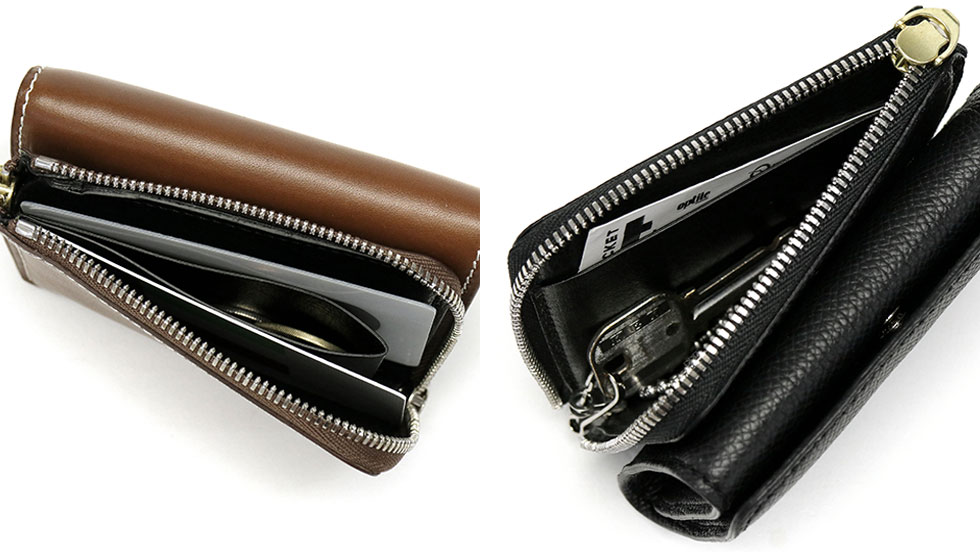 仕様 |[外側] ・ジップポケット(L)×1[小銭入れ×1、カードポケット×2 内蔵] ・ジップポケット(L)×1[ポケット×1、キーチェーン×1(取り外し可能) 内蔵] [内側] ・札入れ×1 ・カードポケット×3