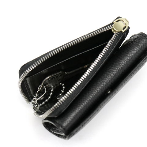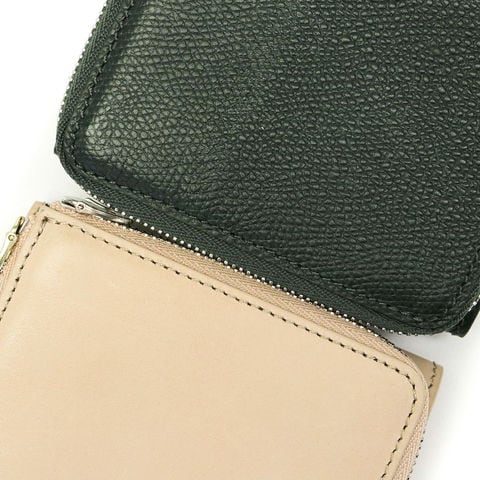 収納面は三つ折りの札入れに加え、L字で分かれた2つのジップポケットを備えています。銀のスライダーポケットには小銭入れを、金のスライダーポケットにはキーチェーンを備えています。各所にカードポケットも備えているので、カードの仕分け管理も可能です。