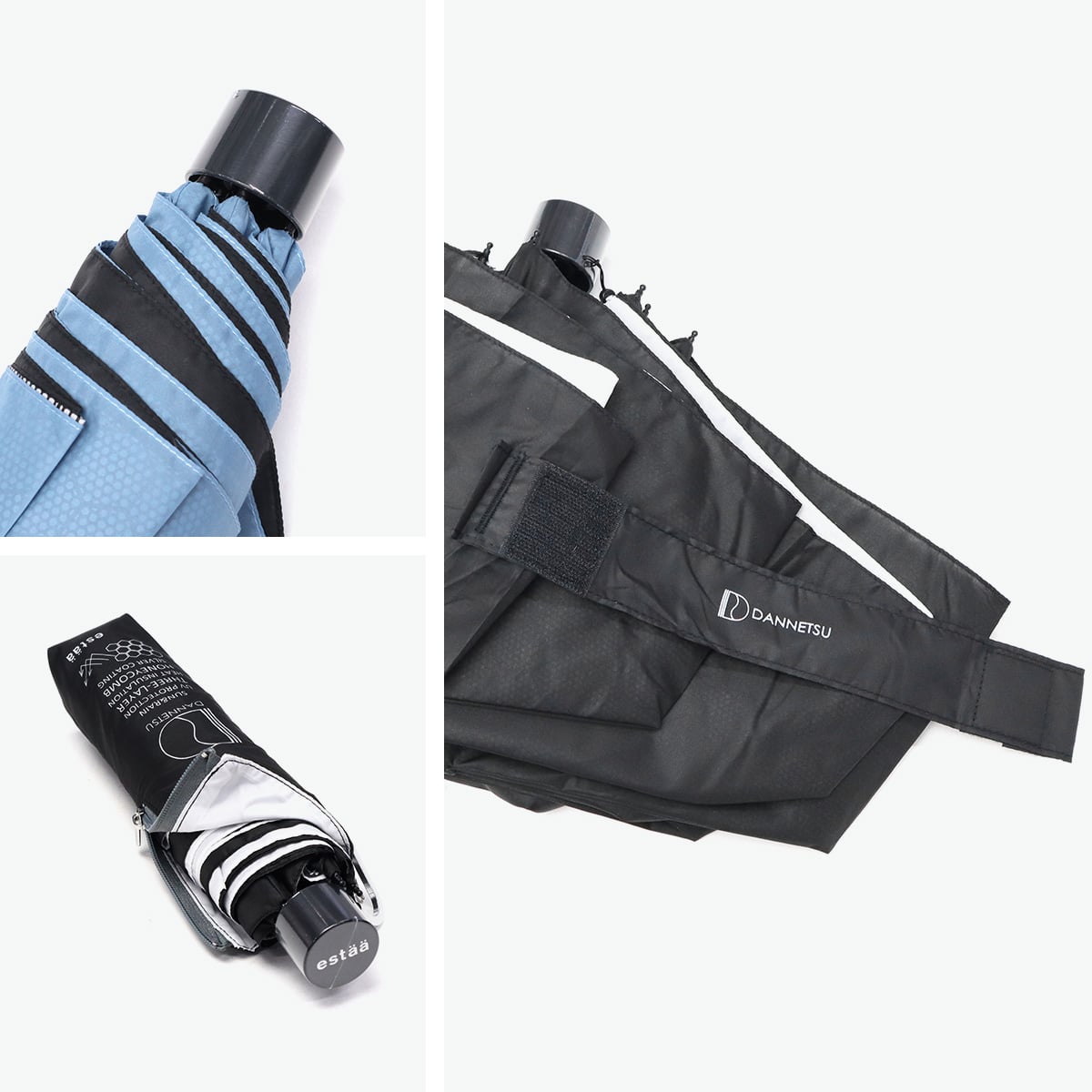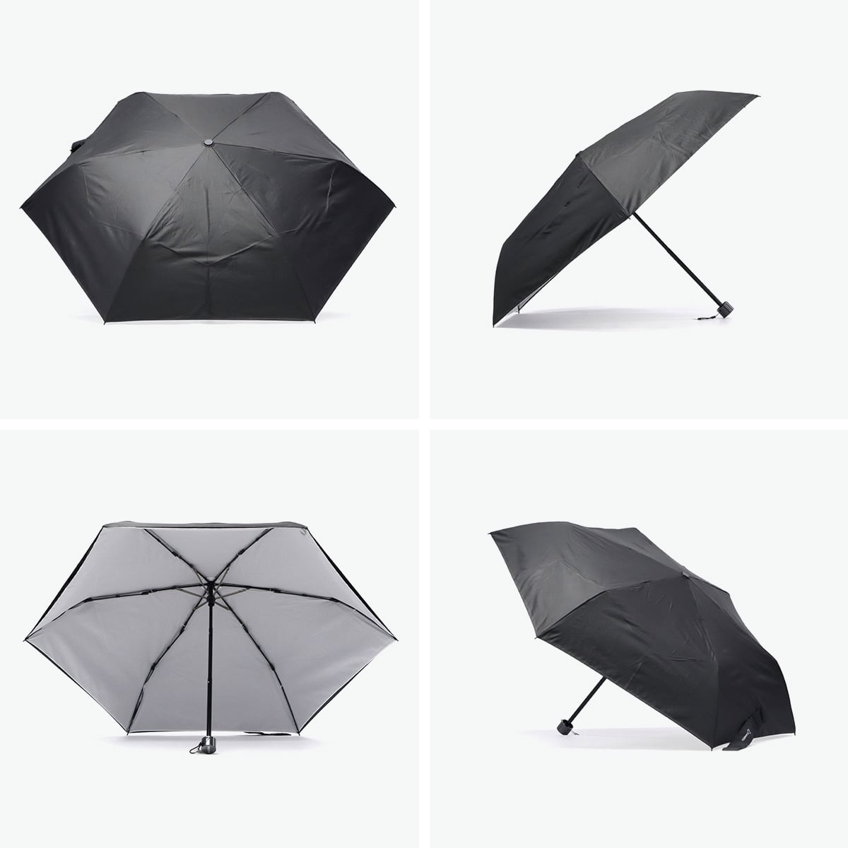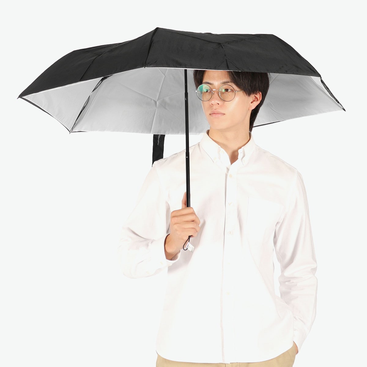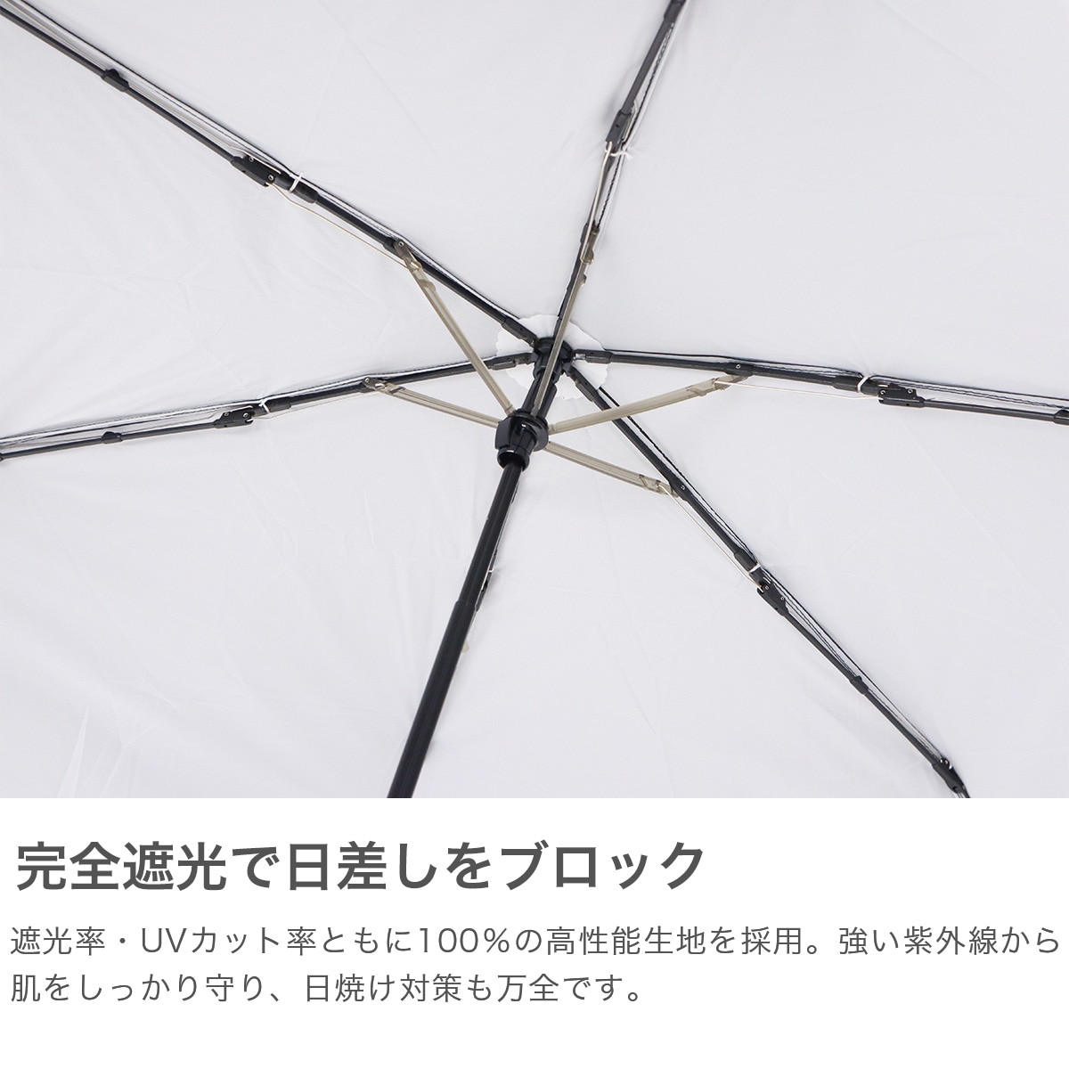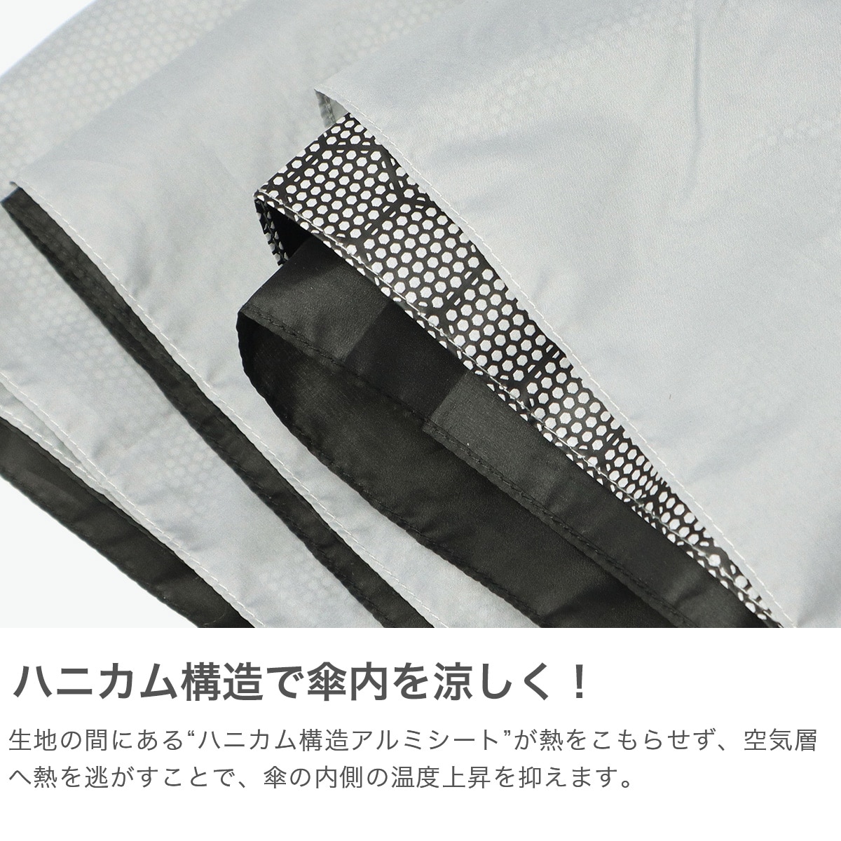 遮光率・UVカット率100%の折りたたみ傘です。生地の間に挟んだハニカム構造のアルミシートが熱を逃がし、涼しさキープ。晴雨兼用で突然の雨にも対応できます。手動開閉で使いやすく、持ち運びにも便利な55cmサイズです。