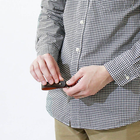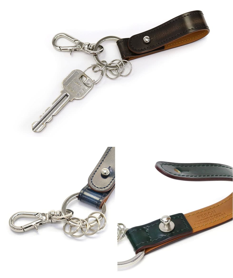 本体のレザー部分はギボシ留めになっており、外すことでループが開き、ベルトや鞄に取り付けて持ち運ぶことができます。また、ナスカンを1ヶ、キーリングを4ヶ装備しておりますので、複数の鍵をまとめて管理が可能です。