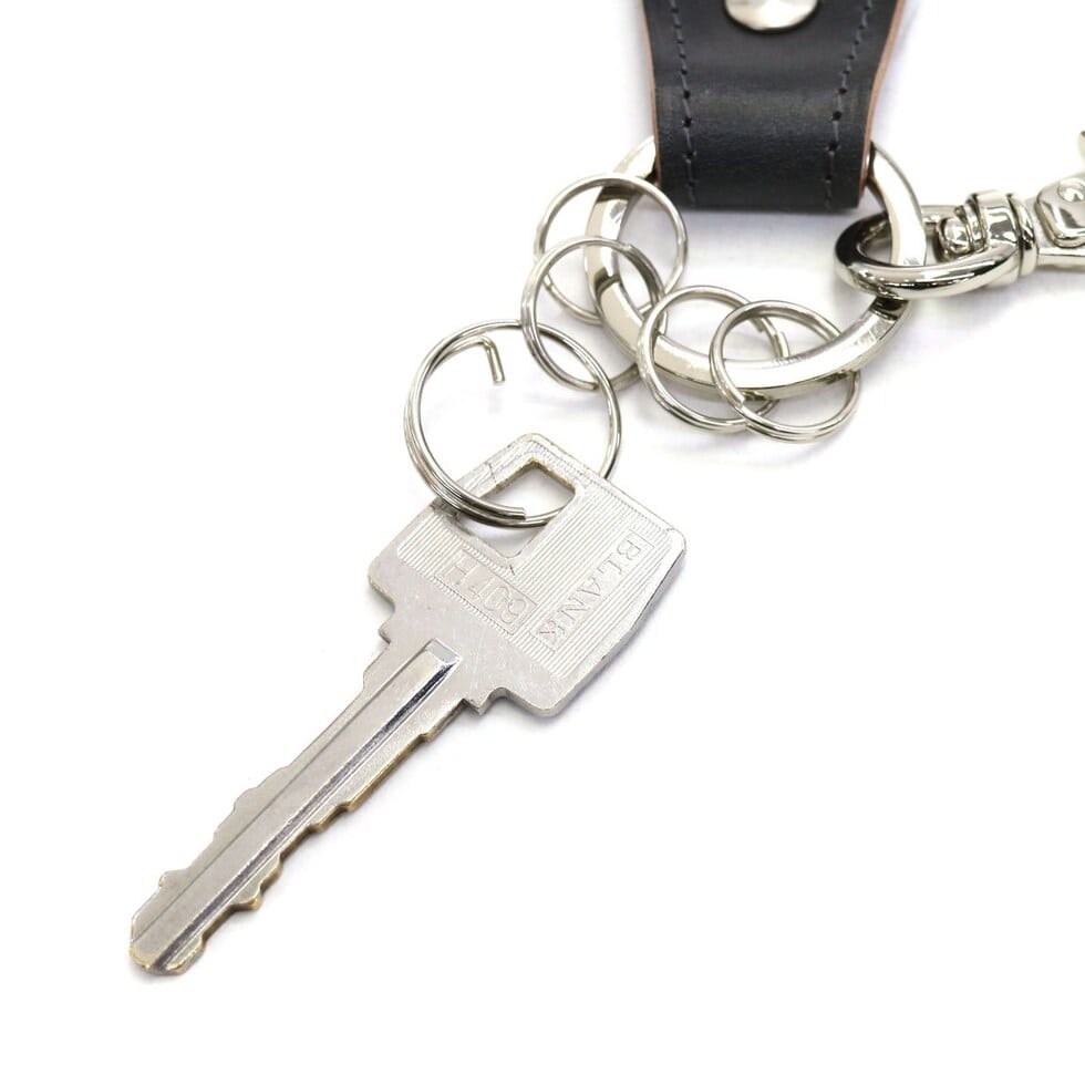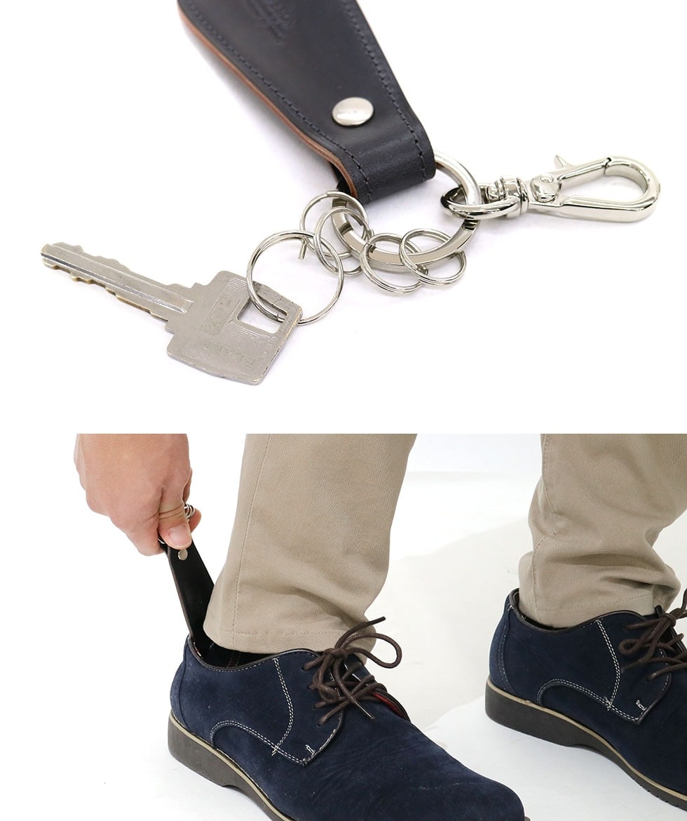 ナスカンを備えることで、ベルトループやバッグなどお好みの場所に取り付けることができ、4連キーリングには鍵や小物の装着が可能。靴ベラは、芯材に金属を使用しないことで、硬さを備えつつもしなやかなフィット感が魅力となっています。