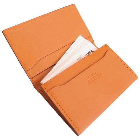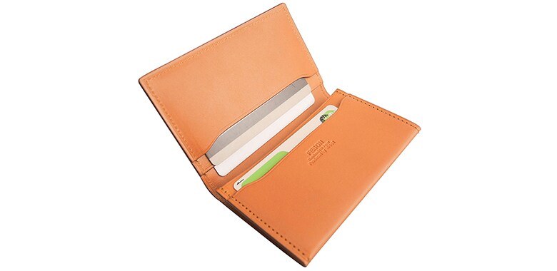 堅牢かつ気品のあるブライドルレザーを使用した名刺入れ。独自のコバ処理によって、革の層や繊維が見えるほど透明感のある切目に仕上げています。内部の収納はベーシックな作りとなっているため使い勝手が良く、ビジネスシーンにおいて上品かつスマートな対応を可能とします。