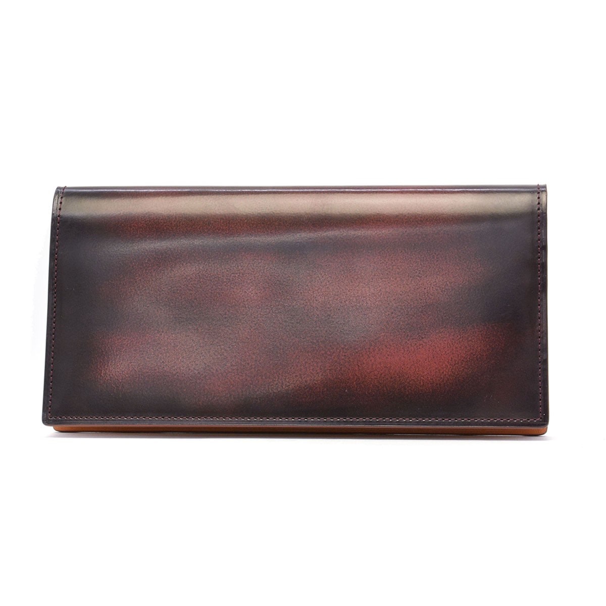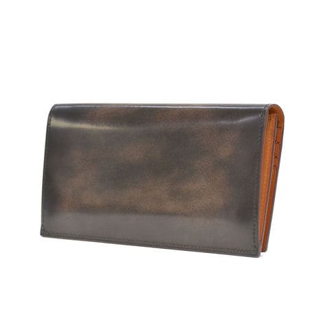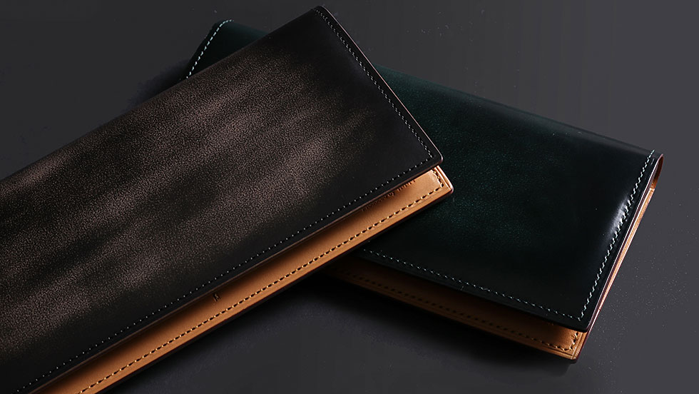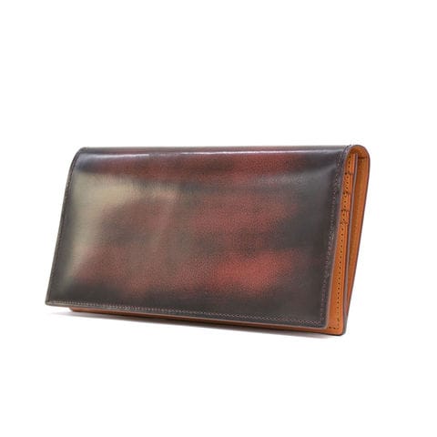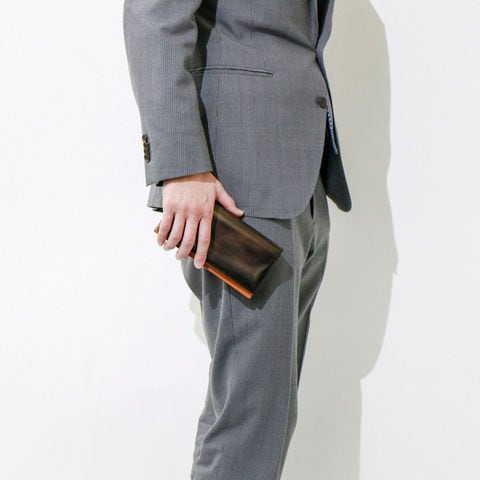 木製家具のようなアンティーク調を演出した、ツヤのある上品なアドバンレザーを贅沢に使用した二つ折り長財布。濃淡ある色合いと高い技術力による細部への作り込みが高級感を高め、深みを増していく大人の雰囲気にマッチする逸品です。
