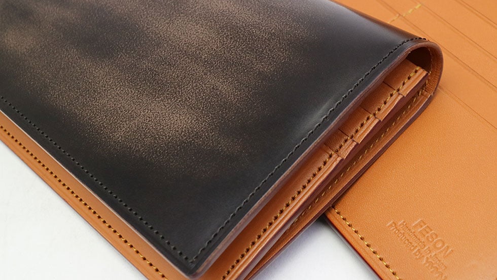 表革には国産のアドバンレザーを使用。いったん塗装を行った色の上にもう一層の塗装を重ね、その後バフ掛けなどを施して上層の色を部分的に落とすことにより、革の表面の色ムラを出しています。さらに、こだわり抜かれた美しいコバの処理がより一層、高級感を生み出しています。