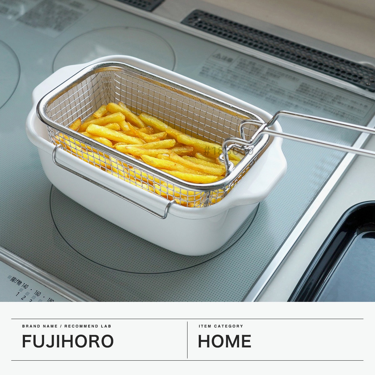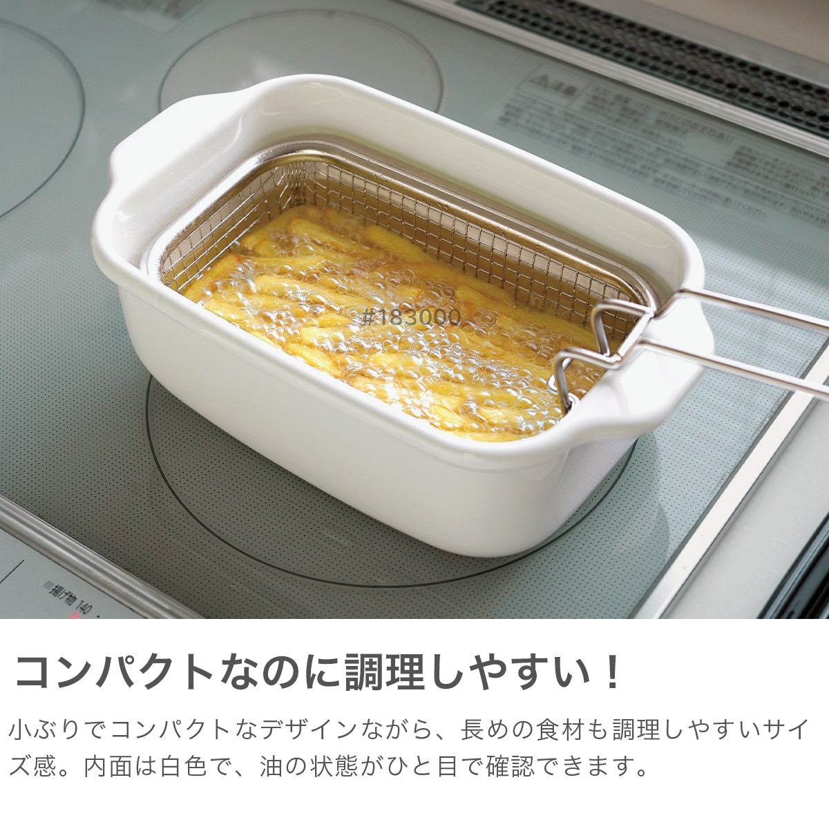 SNSで話題の「角型天ぷら鍋」。付属のフライヤーバスケットはフック付きで油切りが簡単!コンパクトながら、長い食材も揚げやすいスリムな形状も魅力です。白色の内面で油の状態が一目で分かり、適温を保ちやすい温度計付きで、揚げ物初心者でも失敗しにくいのがポイント。油汚れもサッと落とせて、防水温度計は丸洗いOKなのでお手入れもしやすくなっています。一人暮らしの方や、ちょっとしたギフトにもオススメです。